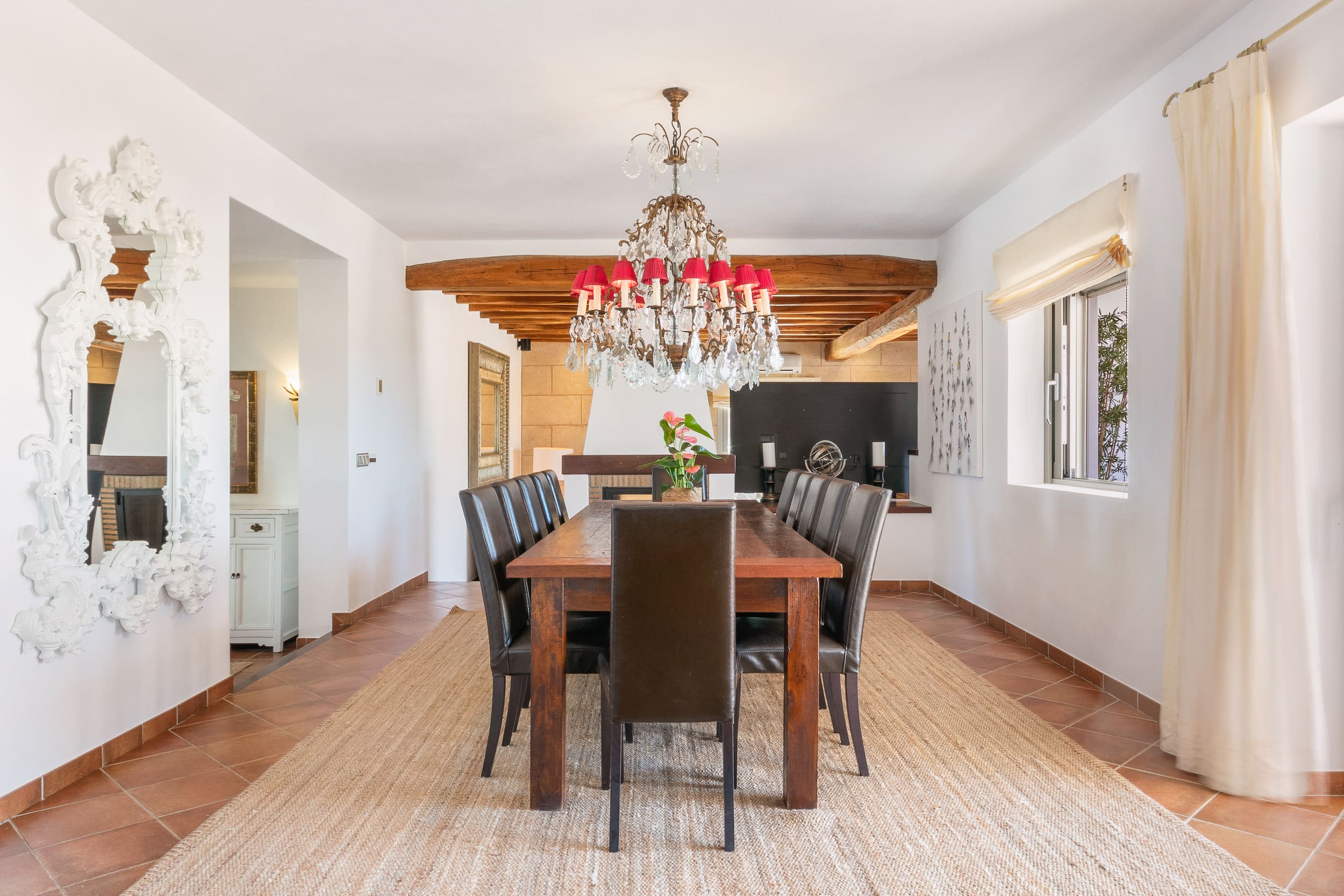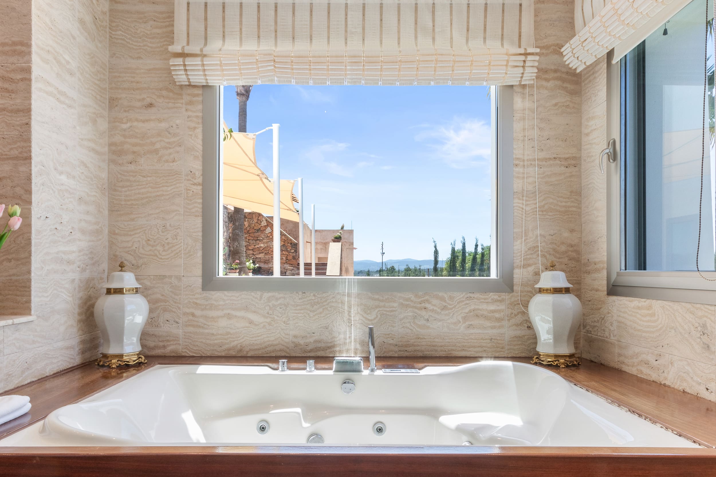 The villa’s outdoor spaces are a true haven of tranquility. Relax by the shimmering swimming pool, unwind in the hot tub, or enjoy a leisurely afternoon under the shaded pergola. The lush gardens provide a picturesque backdrop, with views stretching over the surrounding pine forests and farmland. A summer kitchen with a barbecue allows for delightful al fresco dining experiences under the Ibiza sun.
