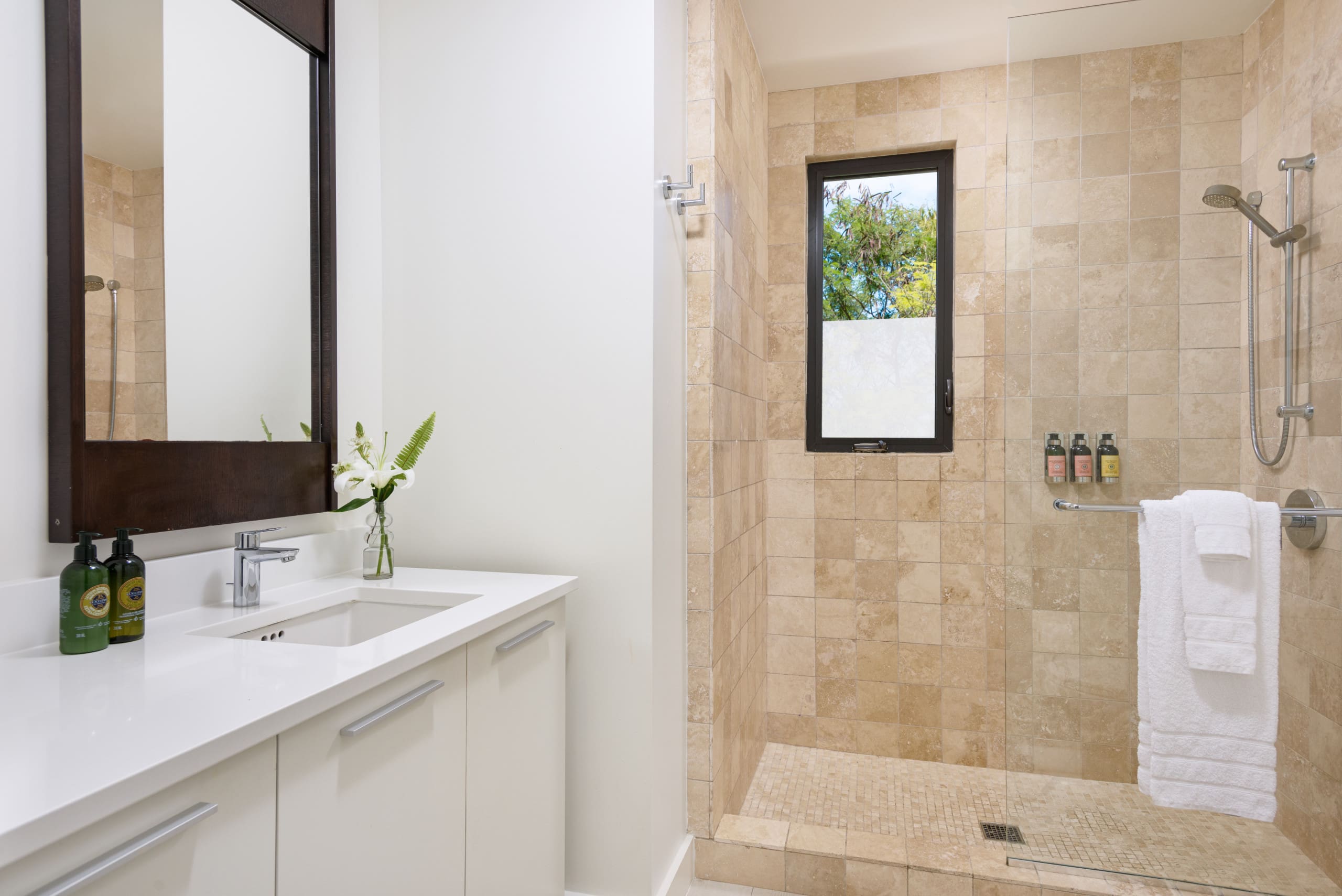 Step outside to find a paradise of outdoor leisure. The private terrace is an idyllic setting for alfresco dining, with seating arrangements that invite sunset cocktails and moonlit conversations. A shared swimming pool and tennis court provide both relaxation and recreation, while the pristine sands of Long Bay Beach beckon just steps away. With lush greenery framing the view, every moment spent outdoors is a celebration of the island’s natural beauty.