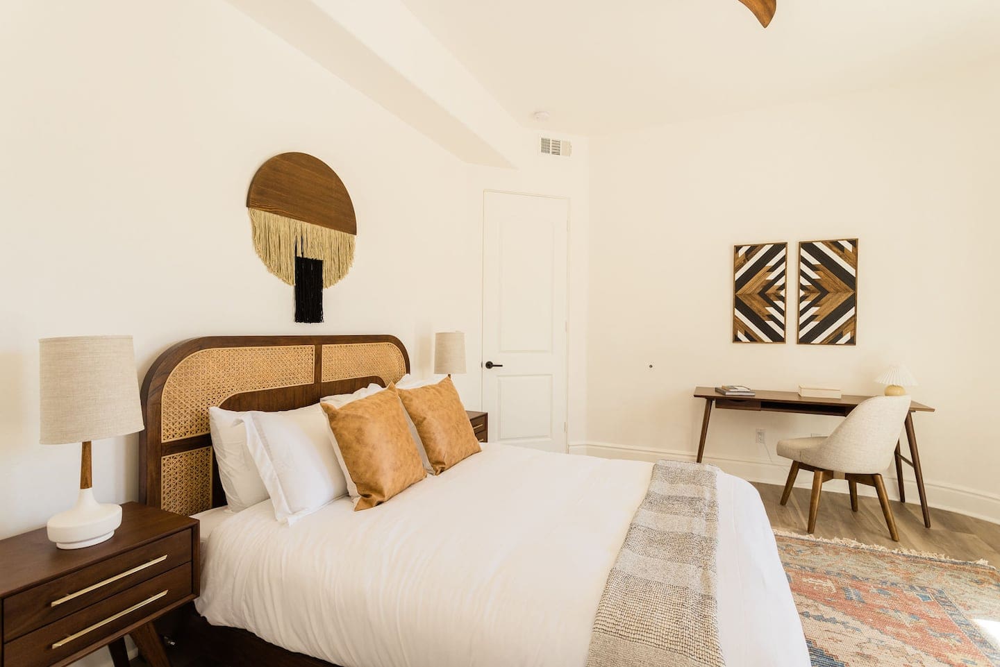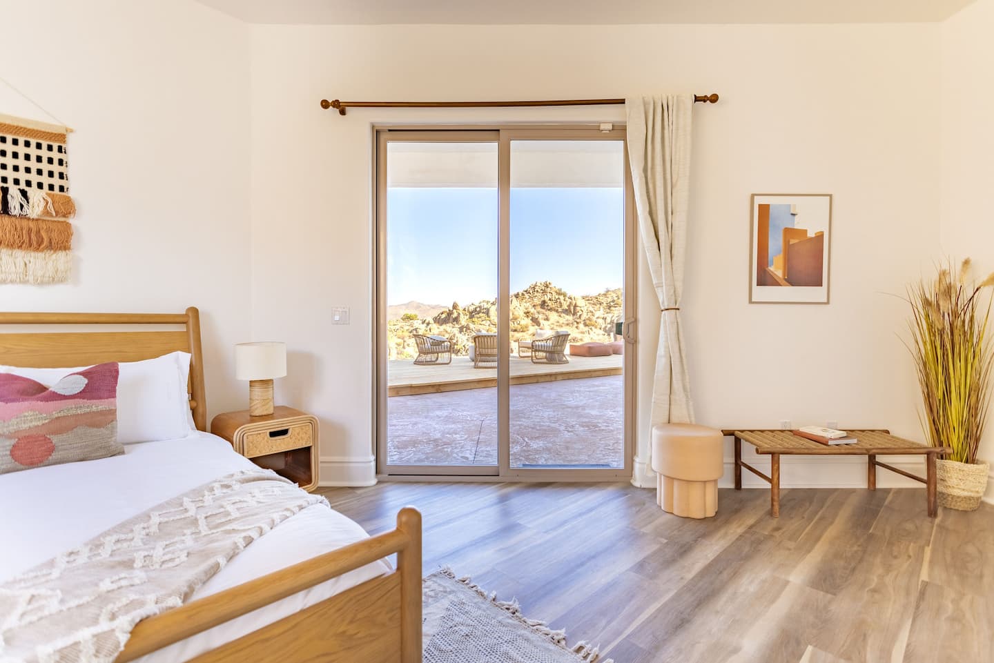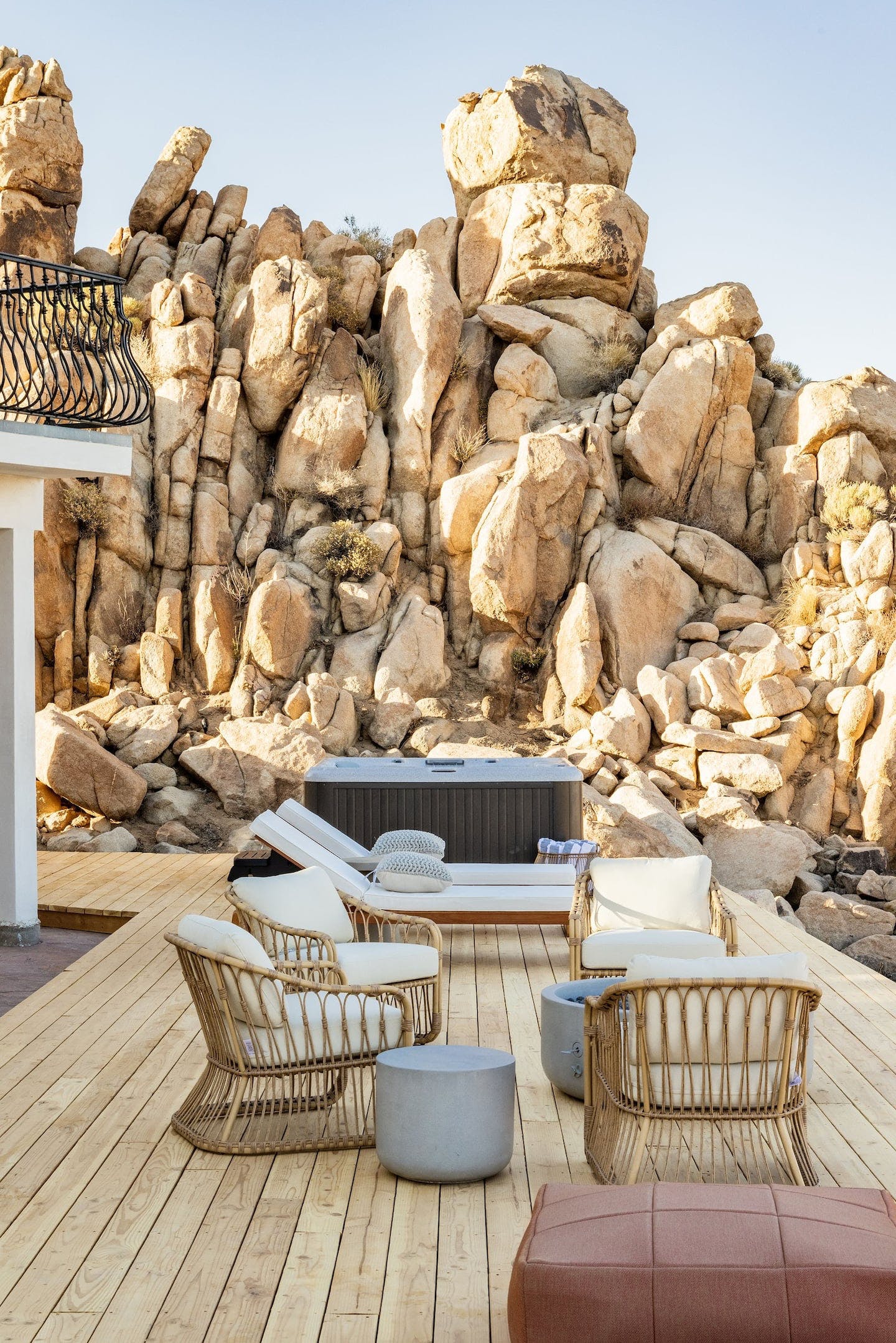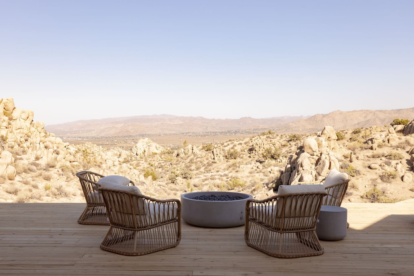 The villa’s outdoor spaces are designed to immerse you in the natural beauty of Joshua Tree. Take a moonlight soak in the hot tub or enjoy a refreshing dip in the sunken cowboy tub as stars twinkle in the vast desert sky. A wooden deck offers a perfect spot to sunbathe or gather around the fire pit, keeping the desert chill at bay while you marvel at the rugged terrain stretching for miles.