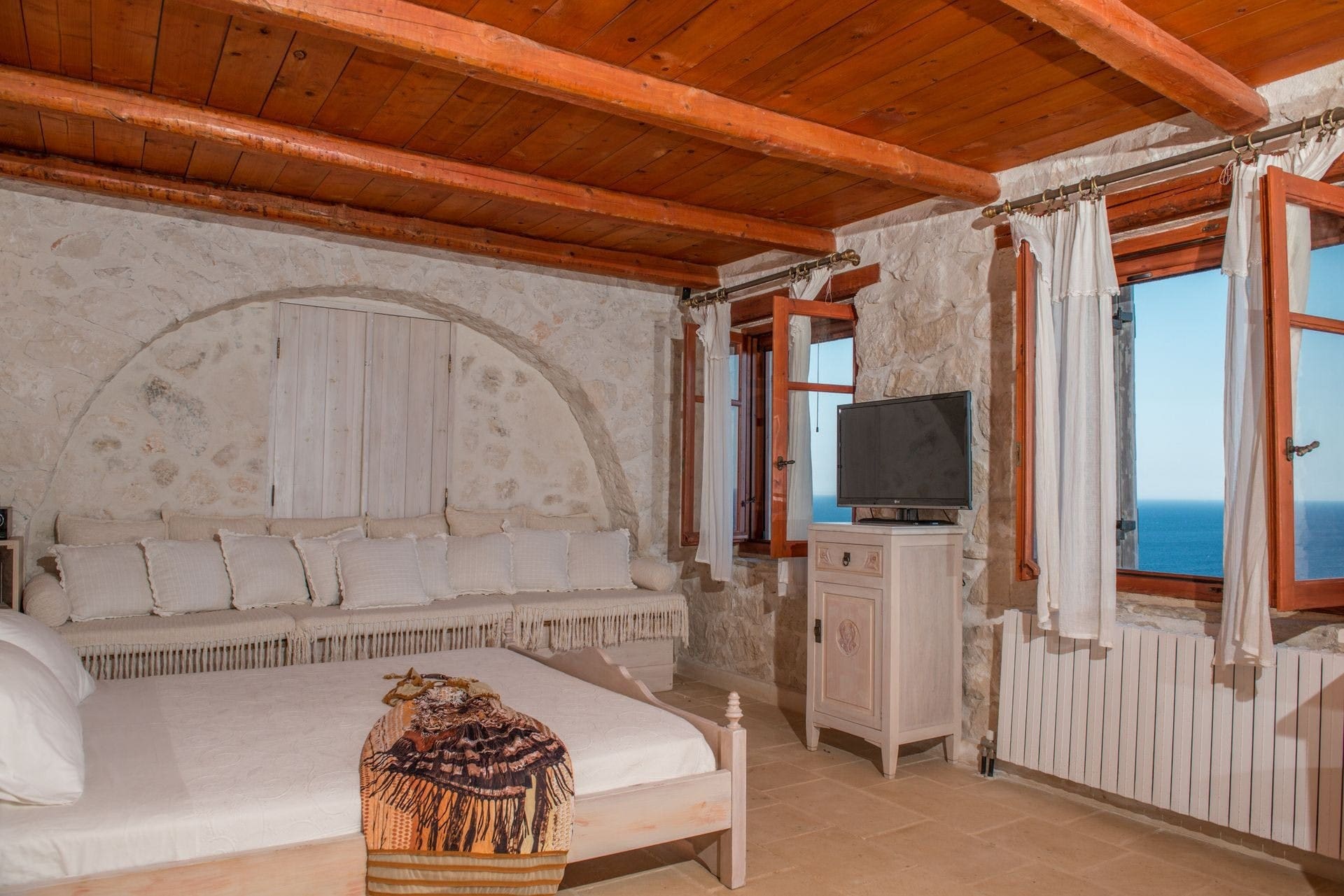 Step inside to find an interior that seamlessly blends traditional Greek aesthetics with contemporary style. The apartment boasts five spacious bedrooms, each adorned with elegant furnishings and luxurious linens. The main living area is a masterpiece of design, featuring plush seating, a cozy fireplace, and large windows that flood the space with natural light. The state-of-the-art kitchen comes fully equipped, making it perfect for both casual meals and elaborate dinner parties.