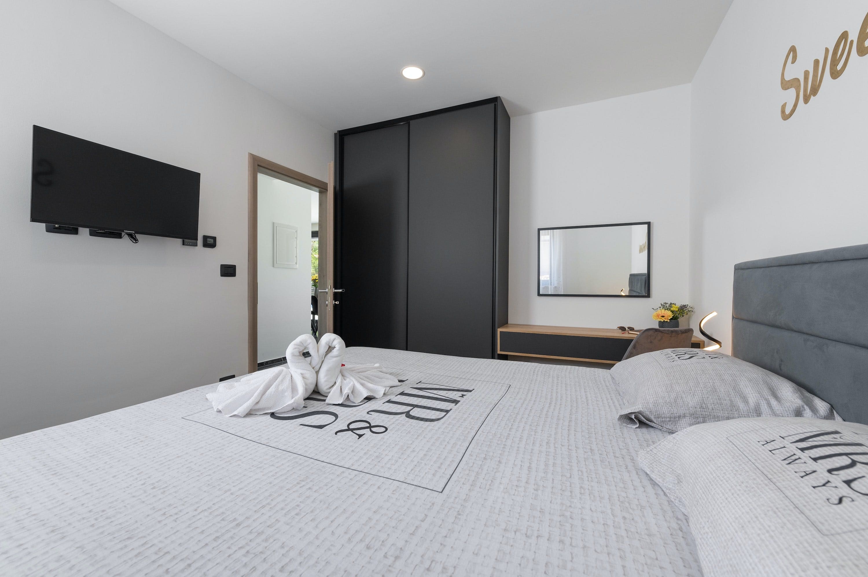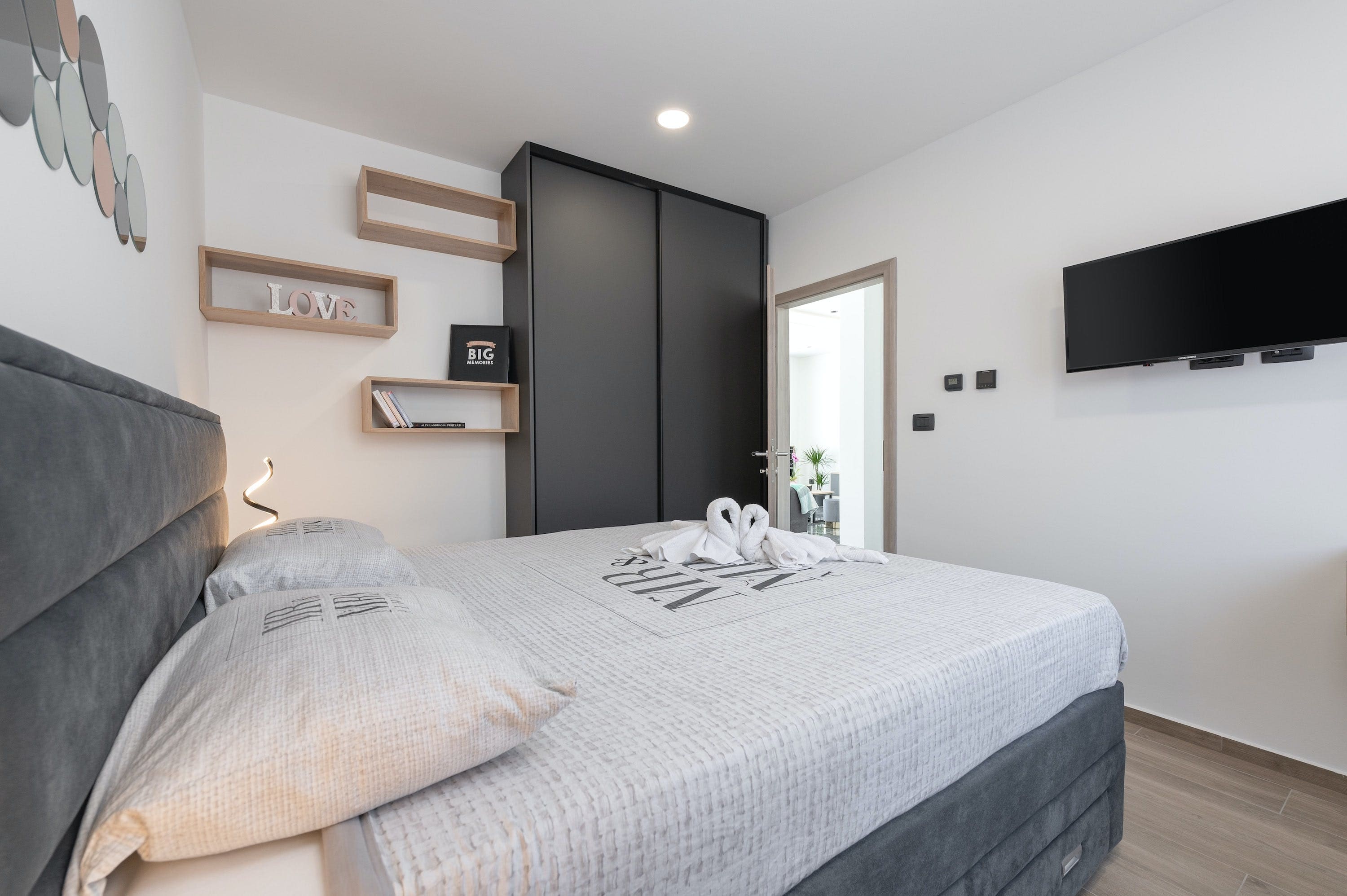 The villa’s interior is a testament to sophisticated design and comfort. Featuring two beautifully appointed bedrooms, each with its own bathroom, this villa is an ideal retreat for couples or small families. The open-plan living area is spacious and welcoming, with modern furnishings and touches of local Croatian charm. The fully equipped kitchen invites culinary exploration, whether you’re preparing a simple breakfast or a romantic dinner for two.