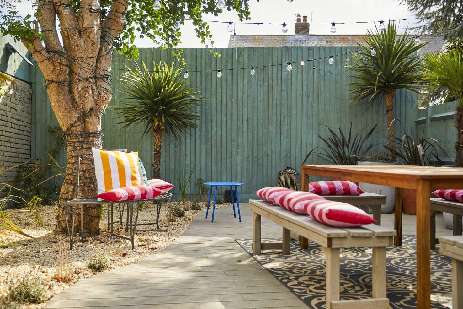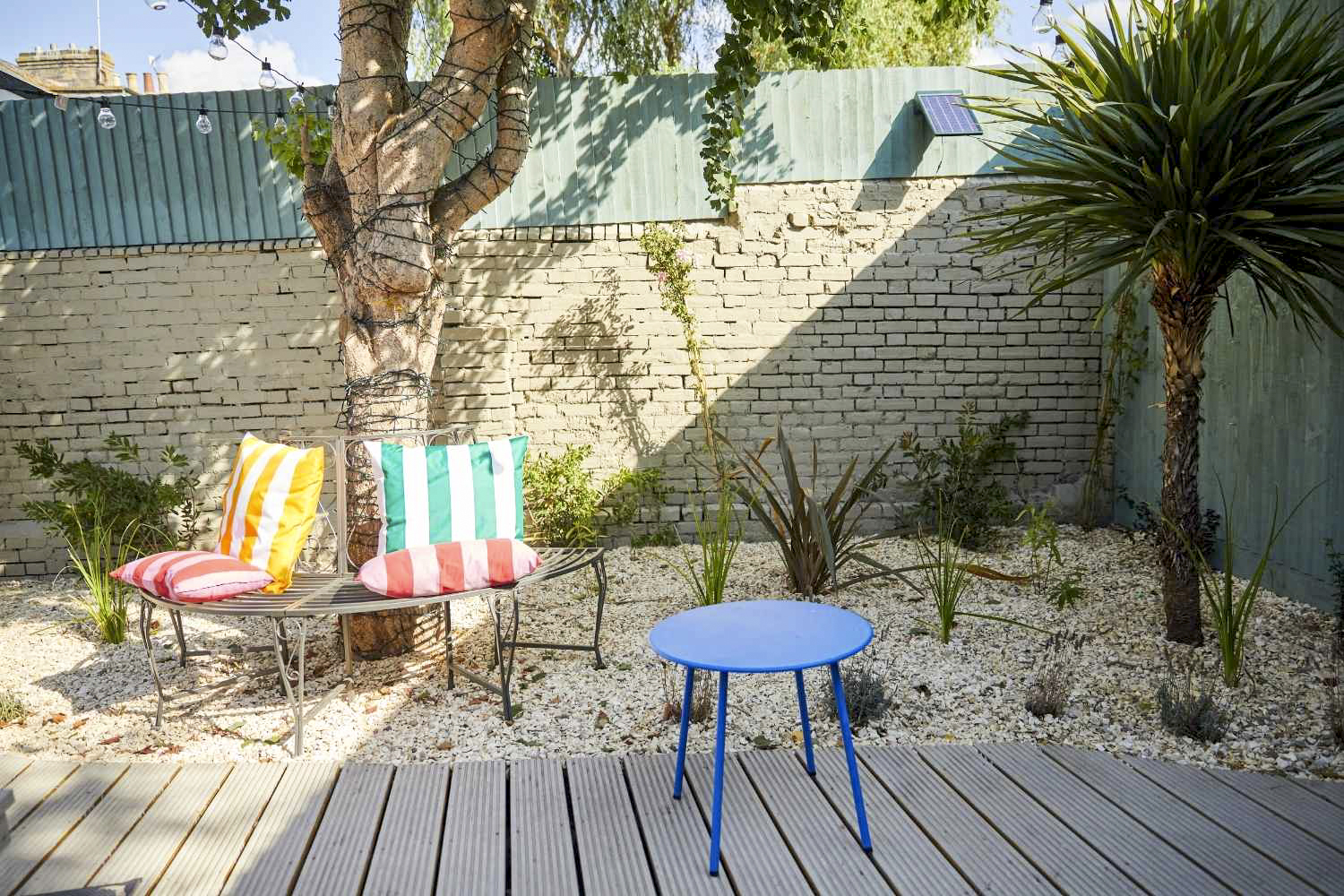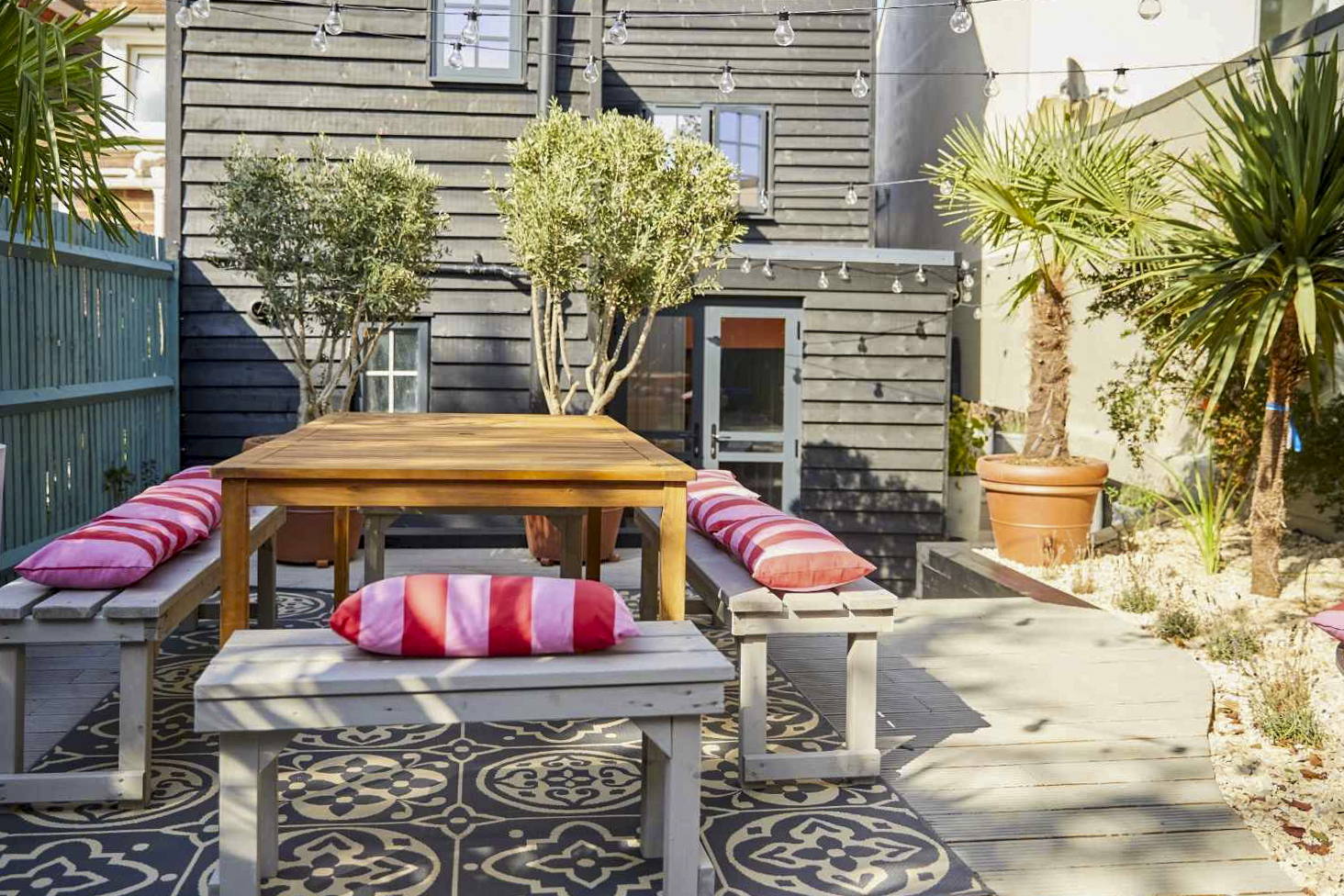 Exterior – Beautiful, south facing, Mediterranean-style, fully enclosed garden with mains-wired festoon lights over the whole space.