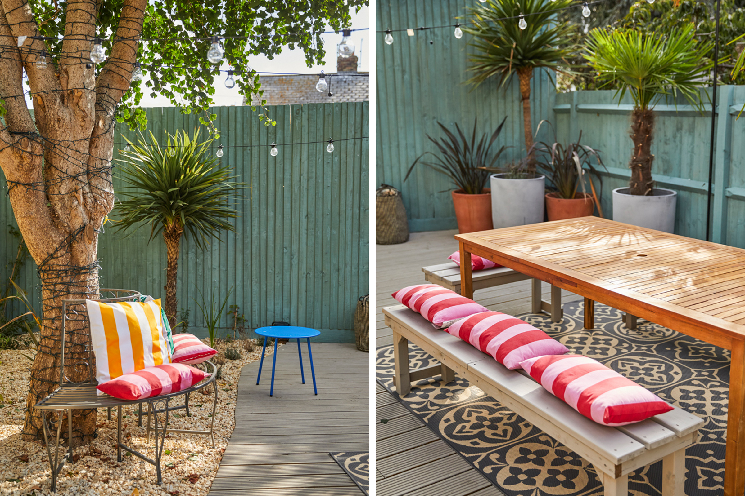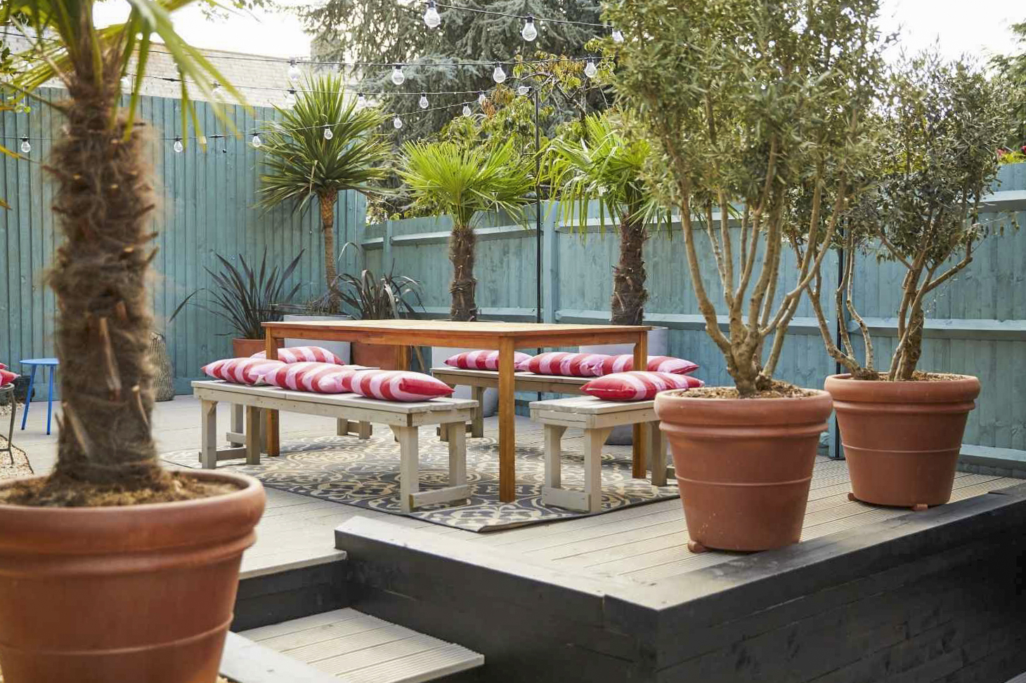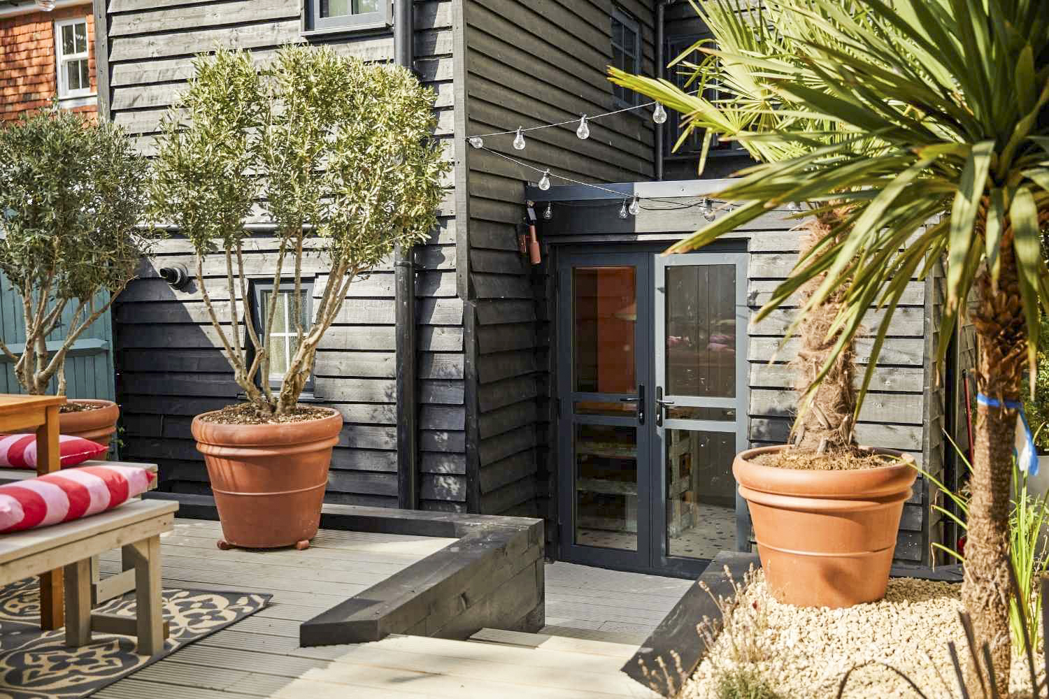 Exterior – Beautiful, south facing, Mediterranean-style, fully enclosed garden with mains-wired festoon lights over the whole space.