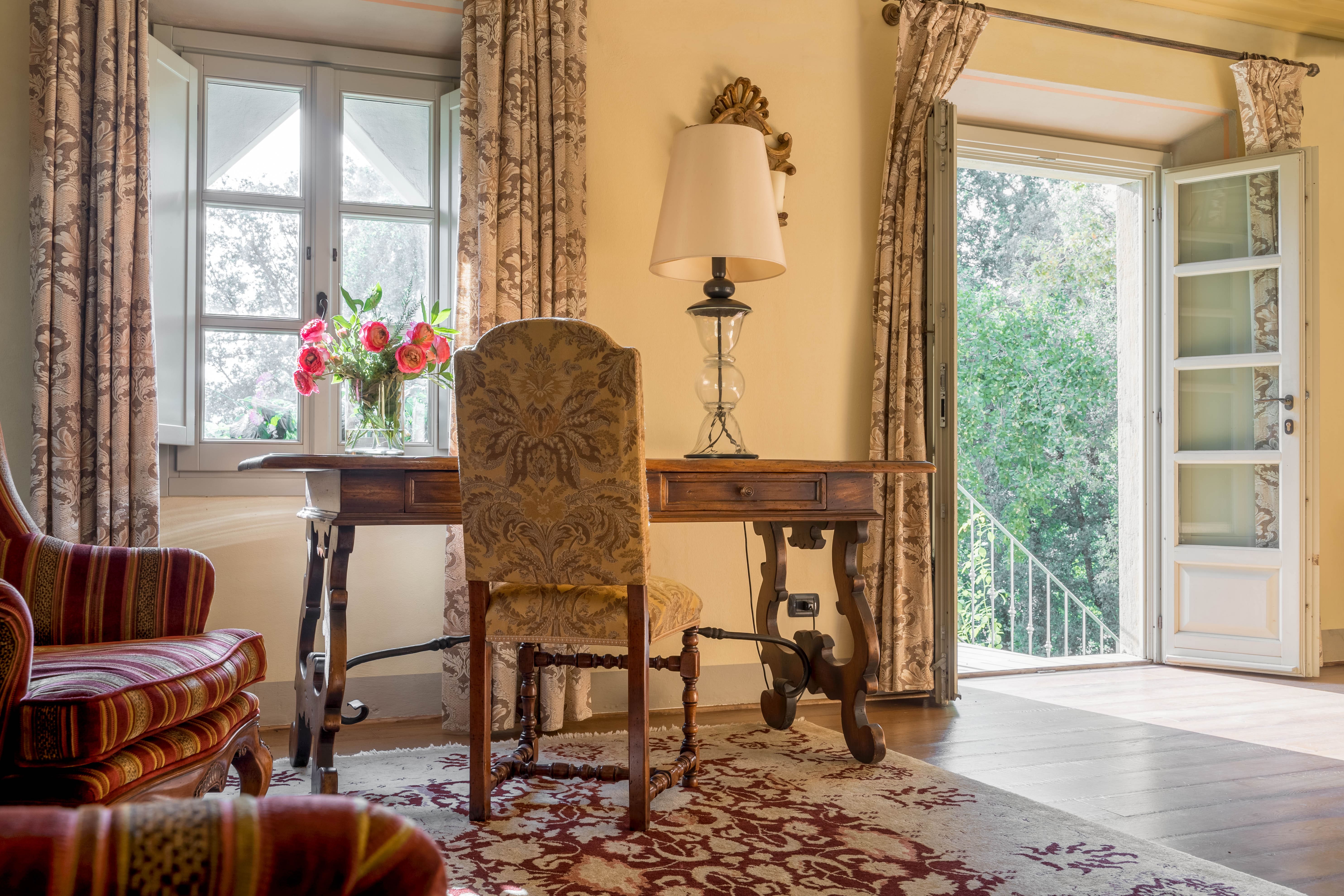 The villa’s outdoor spaces are nothing short of spectacular. The large swimming pool, set amidst verdant gardens, provides the perfect spot to unwind and soak up the Tuscan sun. Enjoy alfresco dining on the terrace, with panoramic views of rolling hills and olive groves that define the region’s breathtaking landscape.