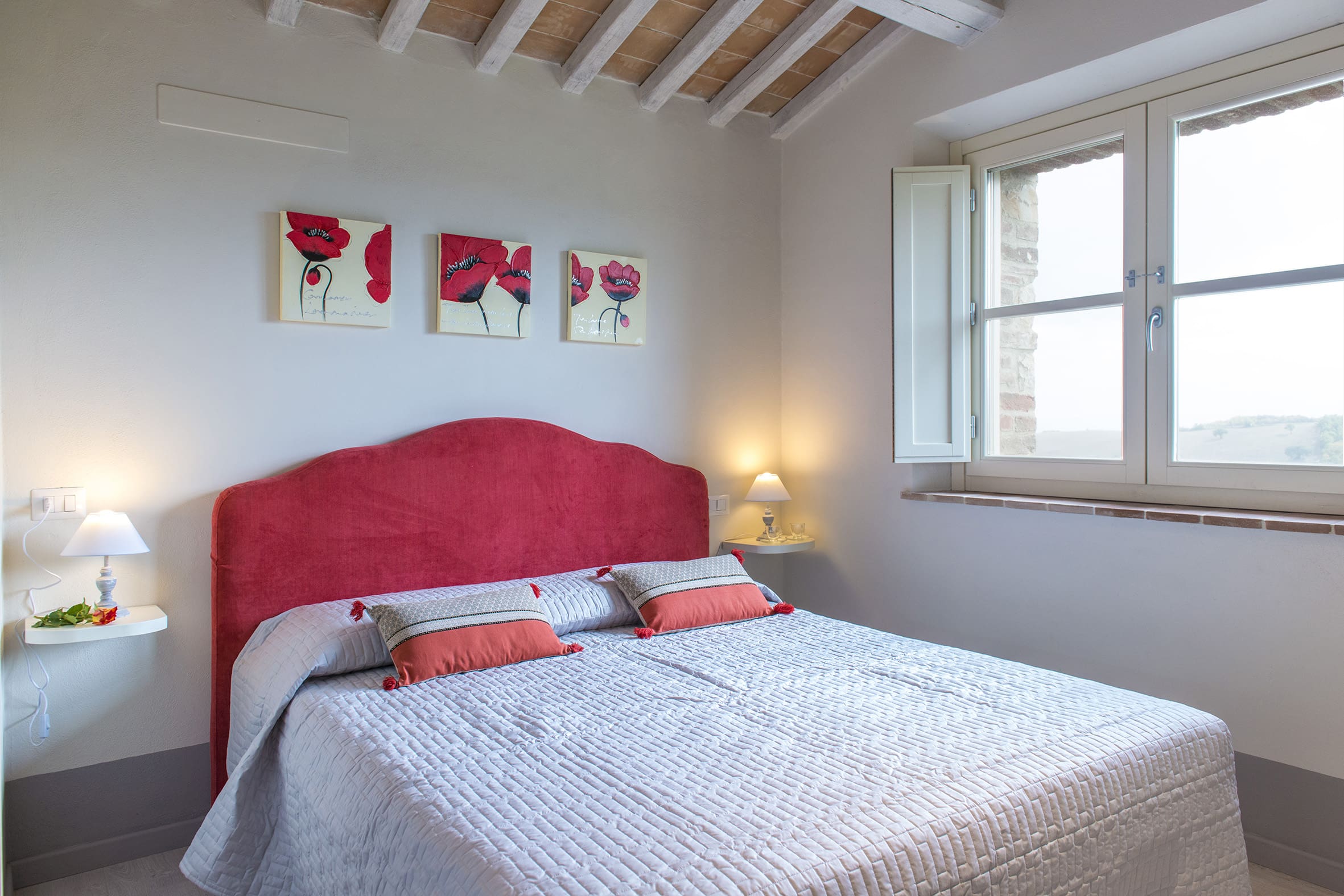 Villa degli Olivi accommodates up to eight guests across four bedrooms and four bathrooms. A car is essential due to its remote location, with ample parking available on-site. The twin beds in one of the upstairs bedrooms can be configured as a double upon request. Pets are welcome, making it a perfect choice for those traveling with furry family members. Browse our luxury villa rentals in Italy for more properties.