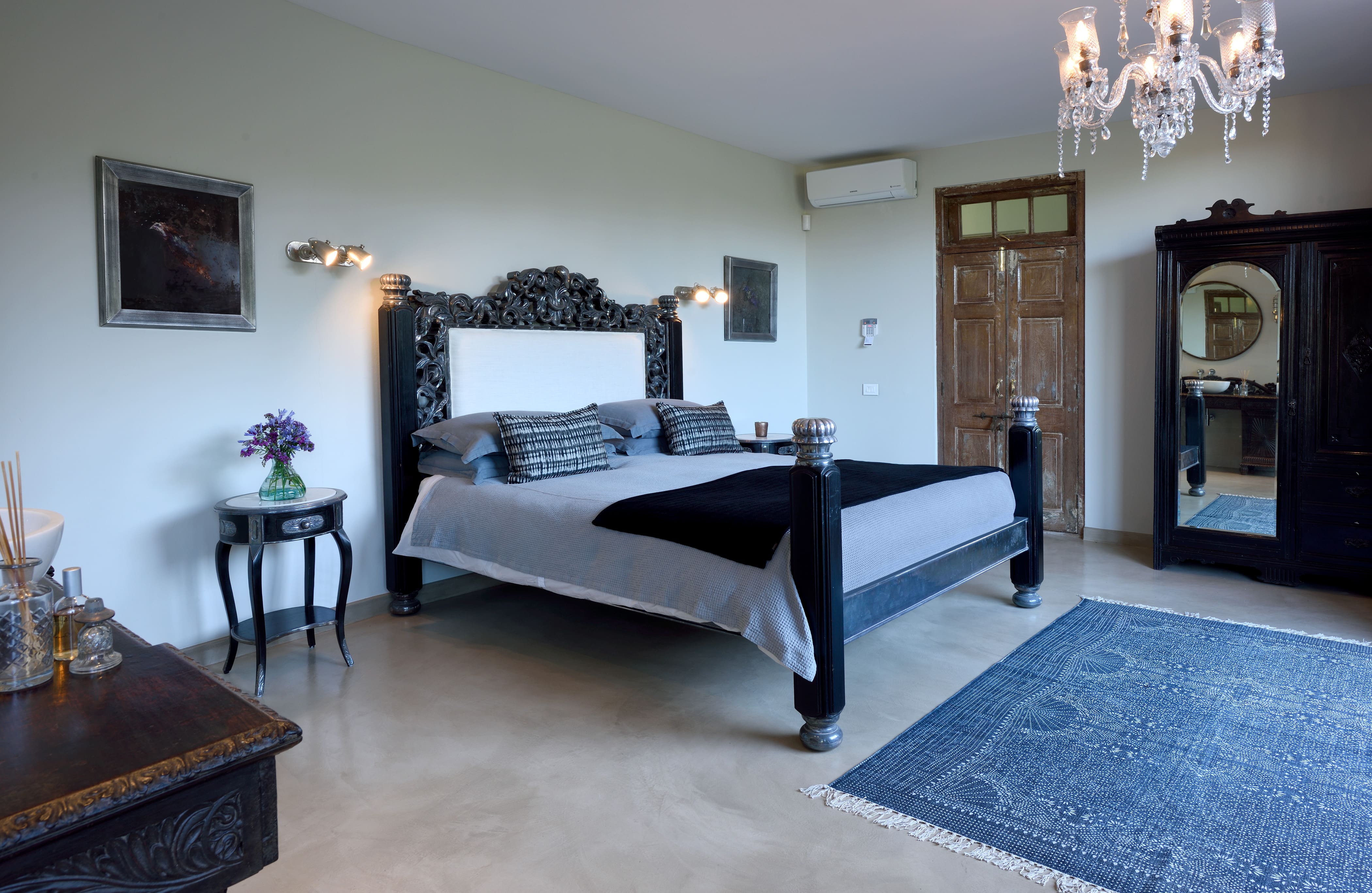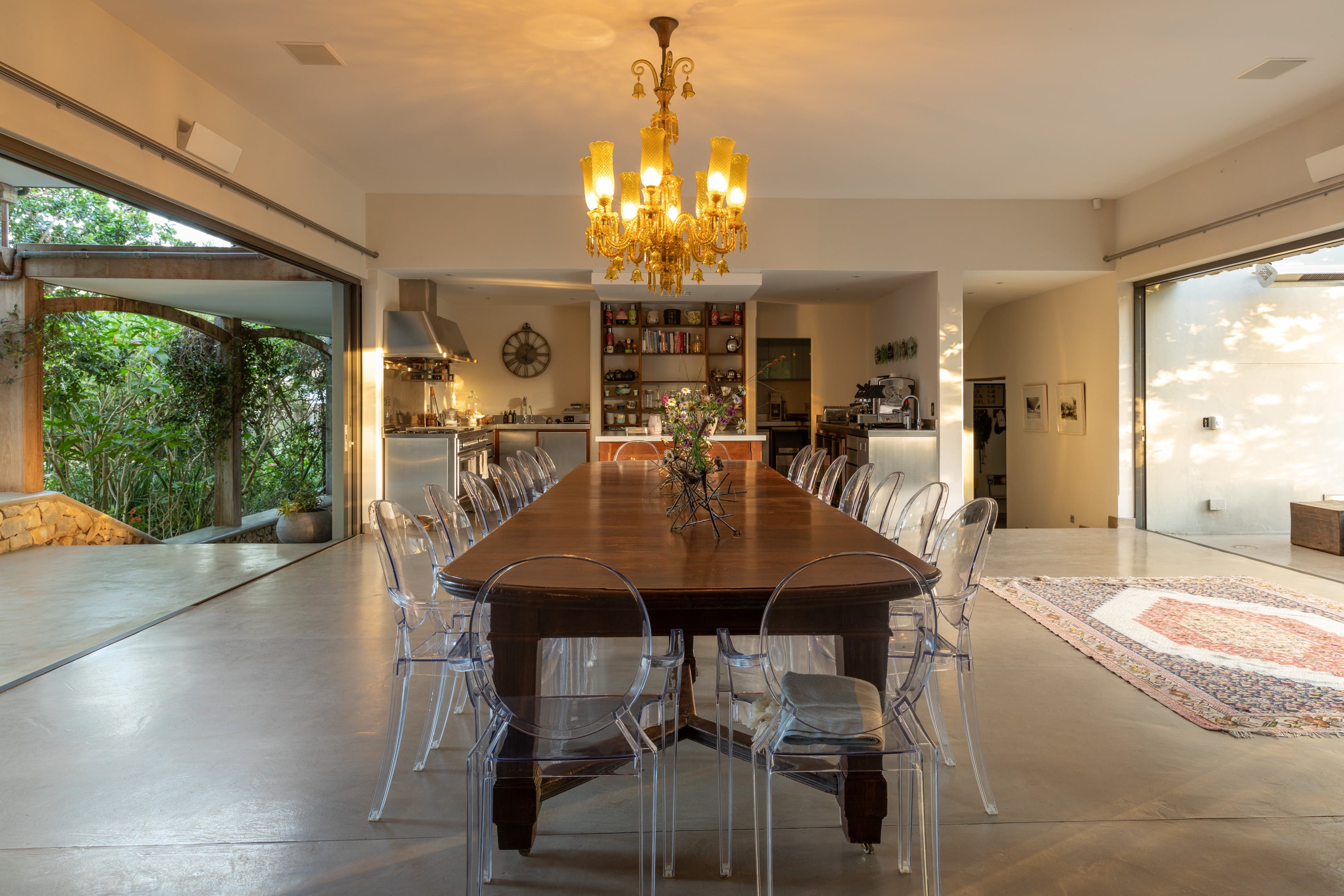 The interior of the villa is a celebration of modern elegance, featuring ten beautifully appointed bedrooms and eleven luxurious bathrooms. The main house boasts eight bedrooms, while the separate cottage houses two additional rooms. Each space is adorned with an eclectic mix of global furnishings and exquisite decor, including an antique chandelier that graces the grand dining area. A state-of-the-art Sonos system fills the living areas with music, while the fully equipped kitchen caters to all culinary needs.