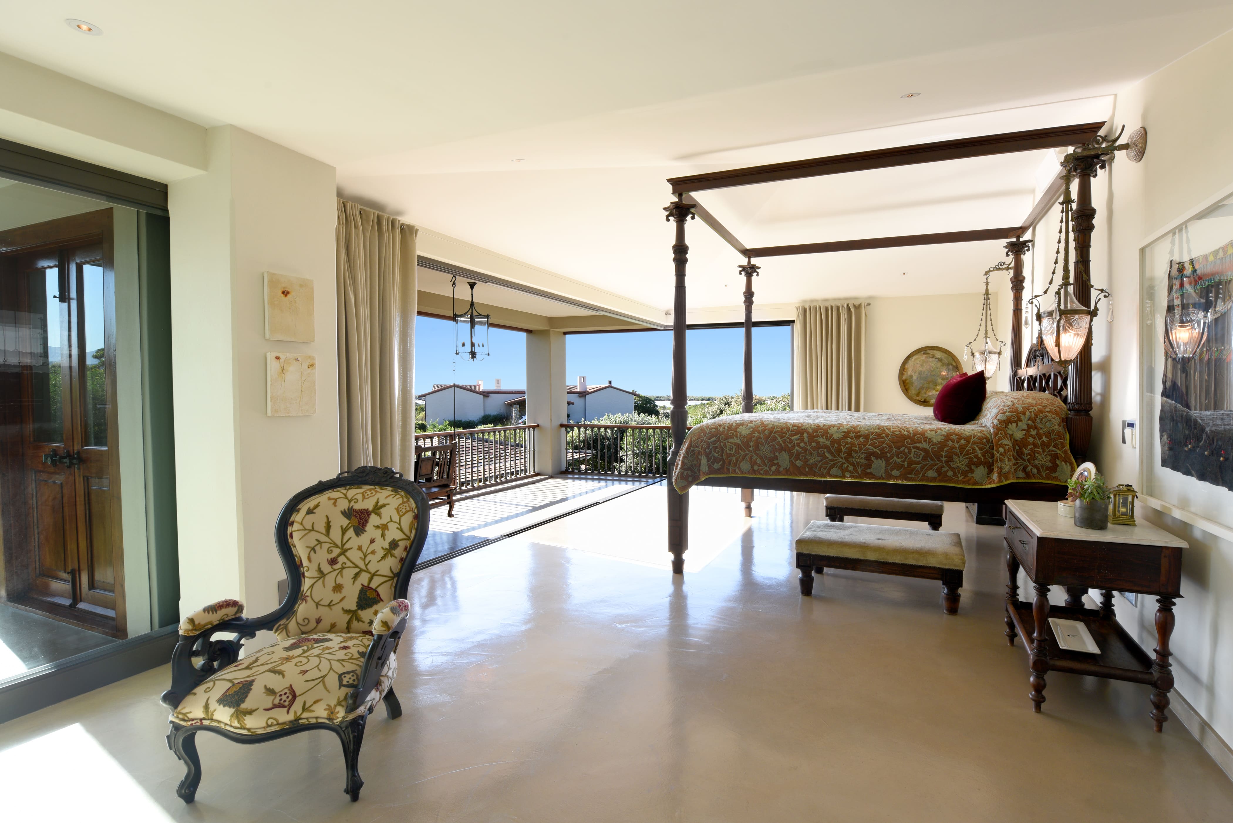 The villa’s outdoor spaces are a haven of relaxation and entertainment. A stunning swimming pool takes center stage, surrounded by lush gardens dotted with indigenous milkwood trees. Enjoy alfresco dining with panoramic views, or unwind in the hot tub while savoring the sea breeze. Golf carts, canoes, and bicycles are available for those eager to explore the surroundings.