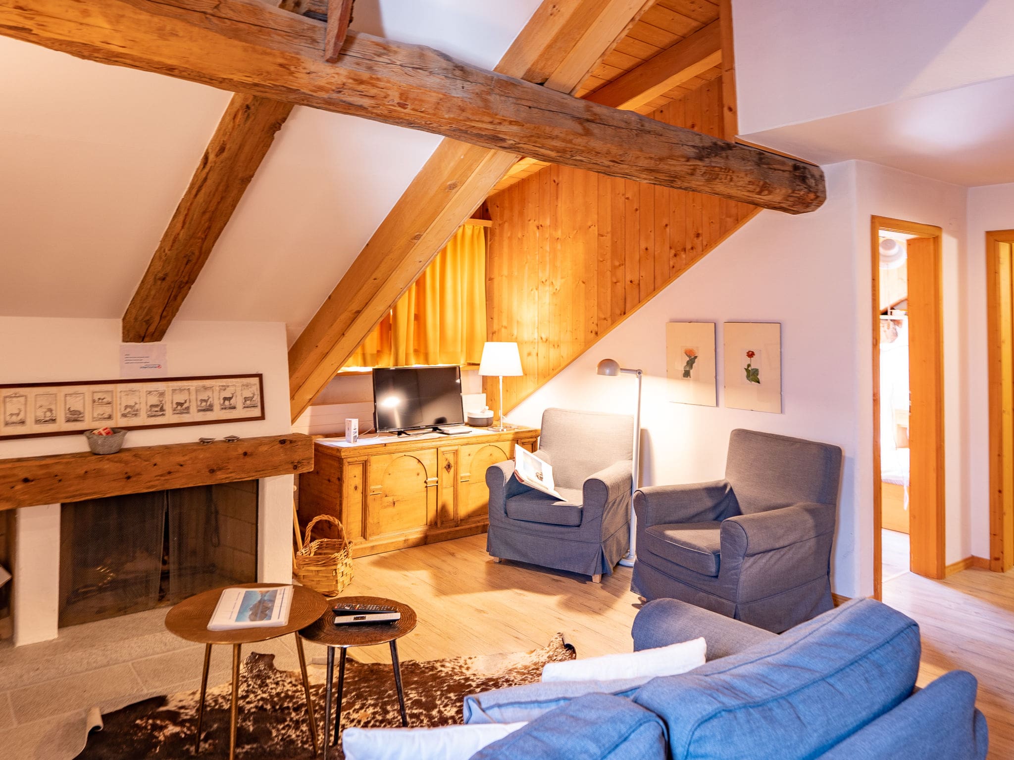 Spread across two levels, this thoughtfully designed 75-square-metre apartment features cosy wooden furnishings and rustic Alpine character. The main level welcomes you with a comfortable living and dining area, complete with a decorative open-hearth fireplace and modern flat-screen television. The fully equipped kitchen includes an induction hob, oven, dishwasher, and Nespresso coffee machine, plus a traditional fondue set for authentic Swiss dining experiences. A children’s room with twin beds and a full bathroom with bathtub, bidet, and WC complete the ground floor. Upstairs via a characteristic steep Alpine stair, the master bedroom features a double bed under sloping ceilings, with an ensuite shower room and charming open gallery area providing side mountain views.