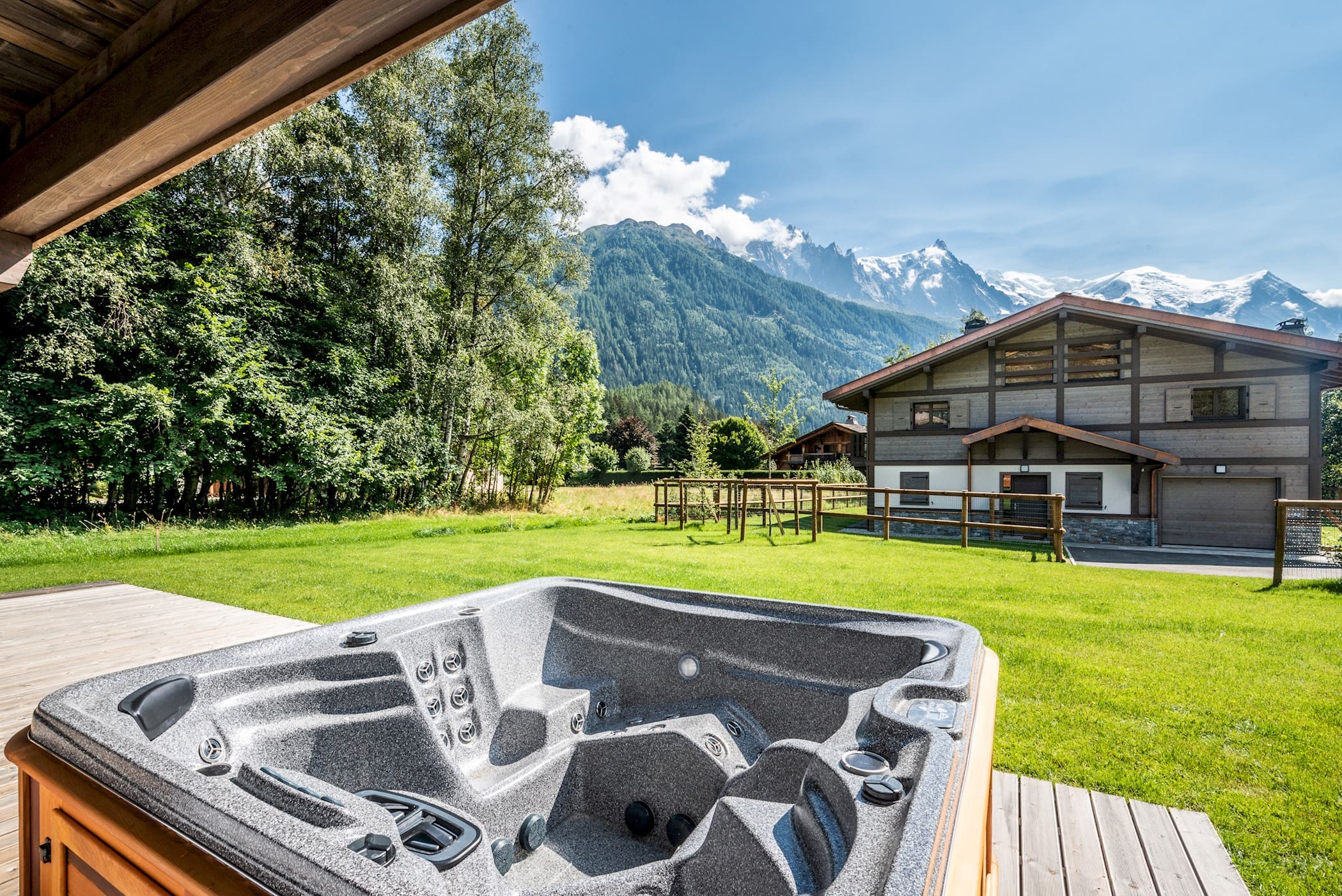 Step outside to enjoy the beautiful outdoor spaces this chalet offers. A private hot tub invites you to relax and soak in the alpine air. The balcony and patio provide perfect spots for morning coffee or evening drinks while savoring the panoramic views of the Mont Blanc massif. The surrounding garden adds to the tranquility, making it an ideal place for family gatherings or quiet reflection.
