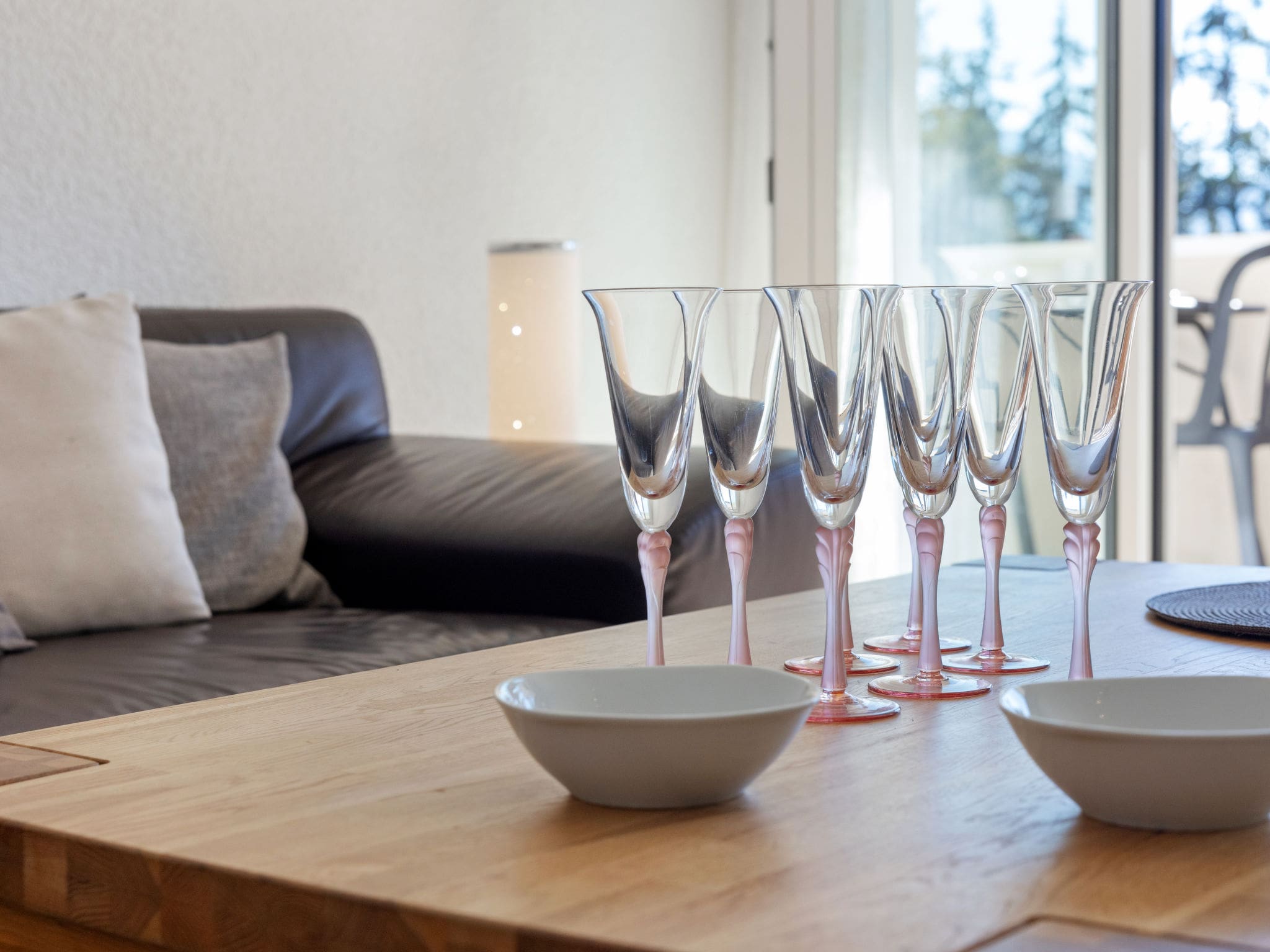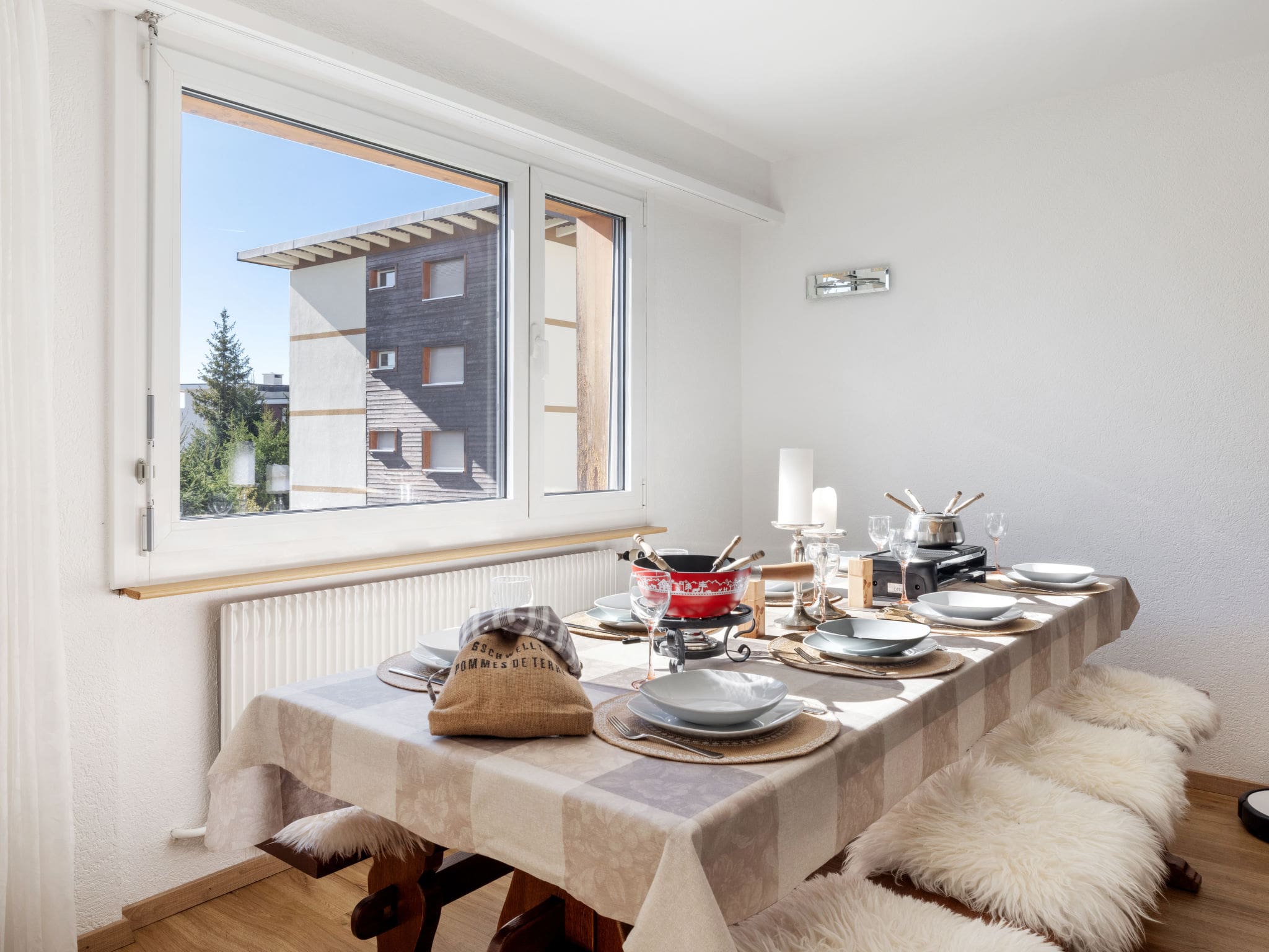 The apartment’s crowning feature is its expansive 15m² balcony, positioned to capture both southern and western exposures throughout the day. Furnished with comfortable deck chairs and outdoor dining furniture, this elevated terrace provides uninterrupted views across the Valais mountains and surrounding countryside. The south-facing orientation ensures maximum sunshine hours, creating an ideal spot for morning coffee or evening aperitifs while soaking in the Alpine atmosphere.