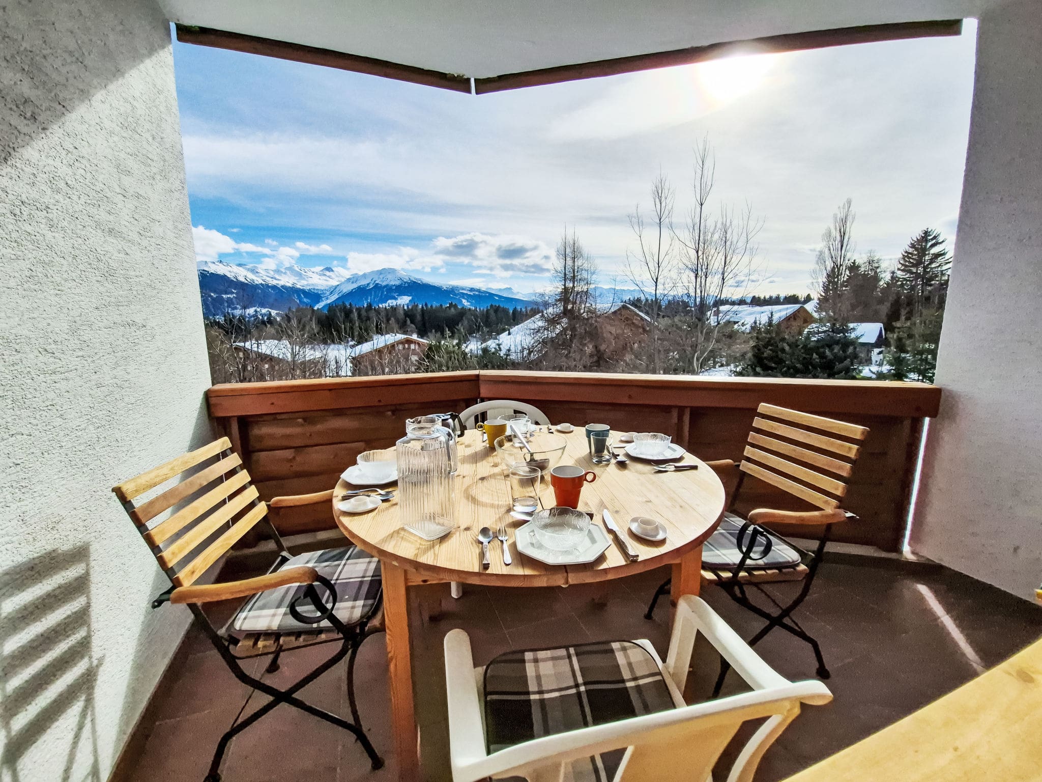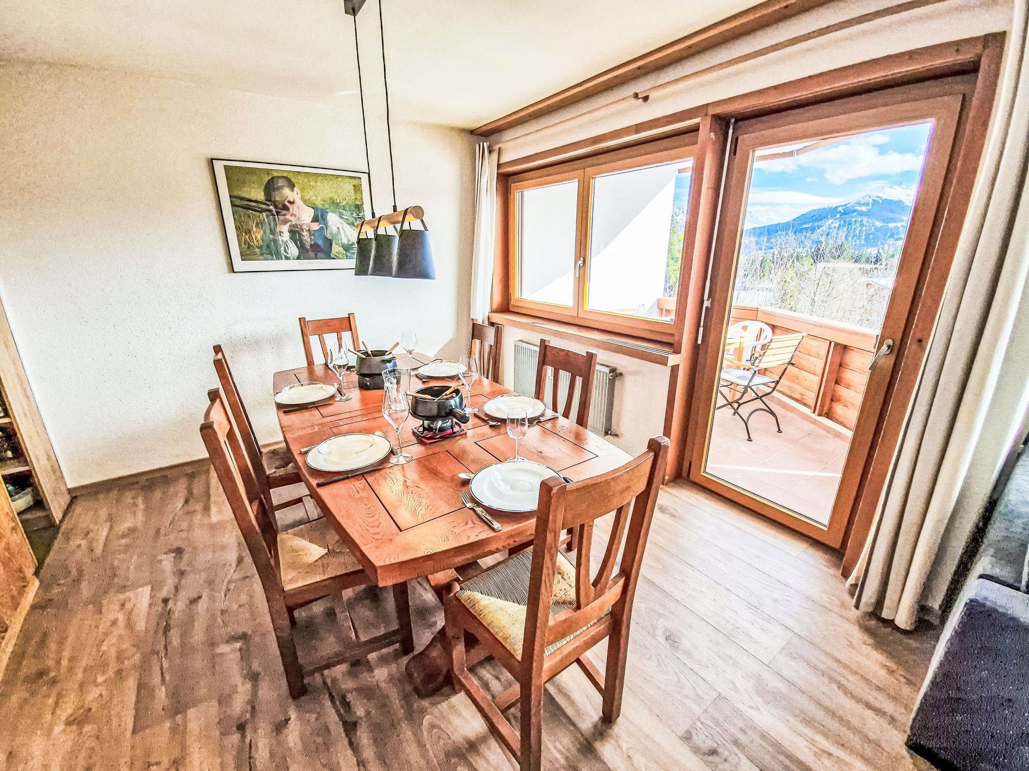 Two south-facing balconies maximize the spectacular mountain setting, each furnished for outdoor dining and relaxation while capturing the warm Alpine sunshine throughout the day. The elevated position ensures uninterrupted vistas across Lake Moubra to the surrounding peaks, creating an ever-changing backdrop of light and shadow across the dramatic landscape.