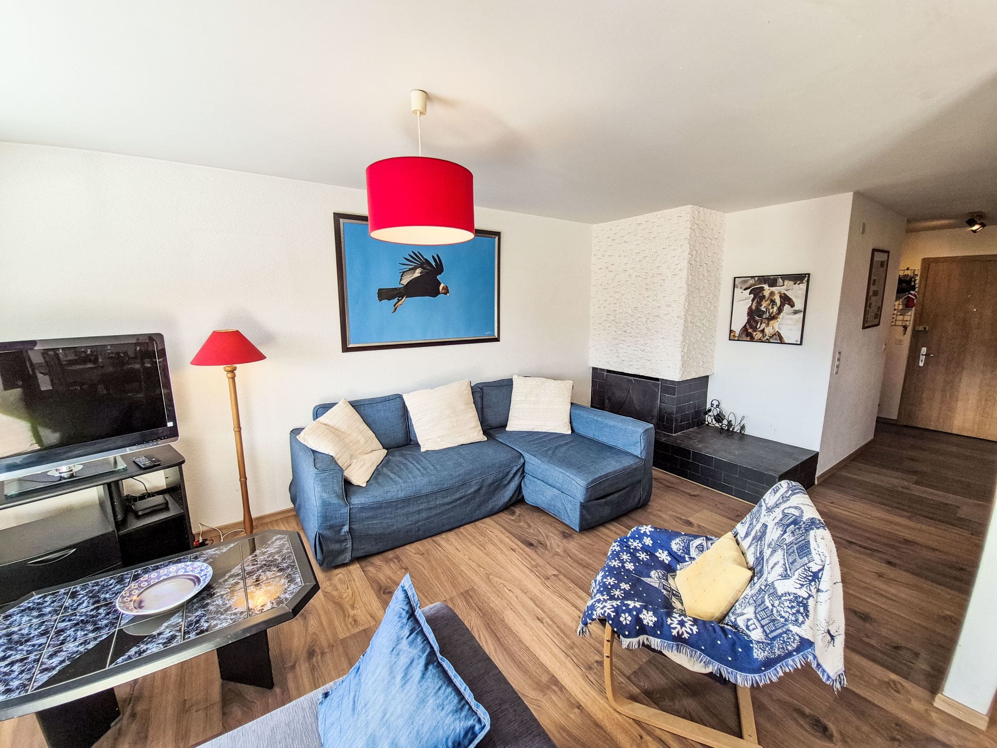 The apartment unfolds across two thoughtfully designed levels, creating an intimate yet spacious environment perfect for mountain holidays. The bright living and dining area features an authentic open-hearth fireplace, establishing a cosy focal point for evening gatherings after days exploring the surrounding peaks. Floor-to-ceiling windows flood the space with natural light while framing spectacular panoramic views of the lake, mountains and countryside beyond.