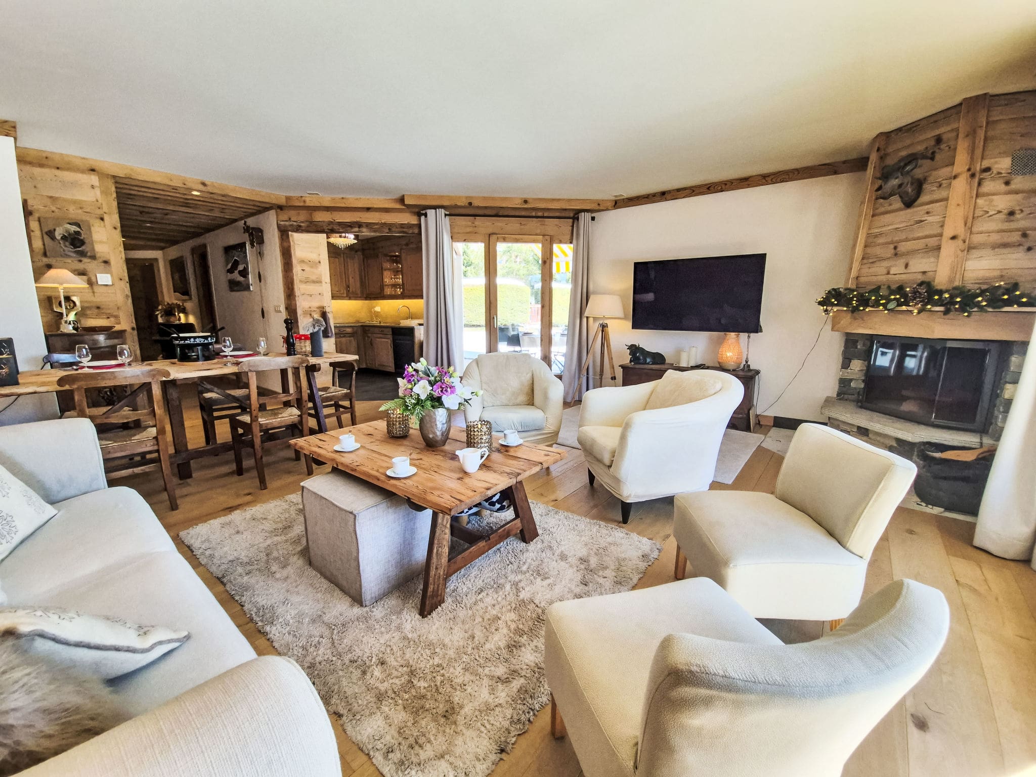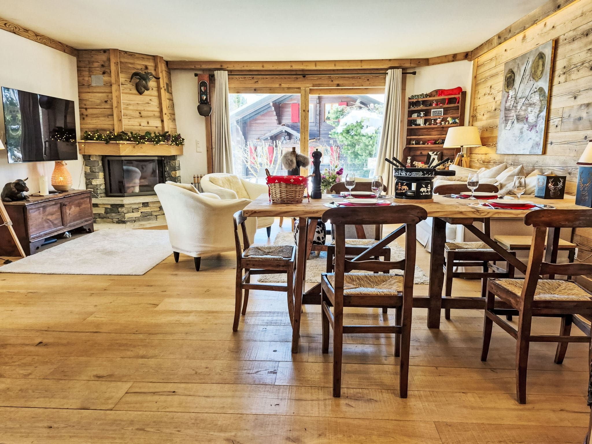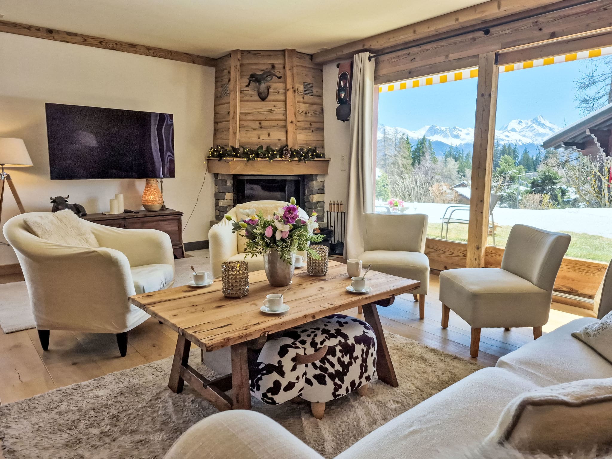 The chalet’s interior showcases the finest elements of contemporary alpine design, where traditional Swiss charm meets modern luxury. The spacious living and dining area centres around a magnificent open-hearth fireplace, creating an inviting atmosphere for evening gatherings after days exploring the mountains. Floor-to-ceiling windows flood the space with natural light while framing spectacular views of the surrounding peaks and countryside.