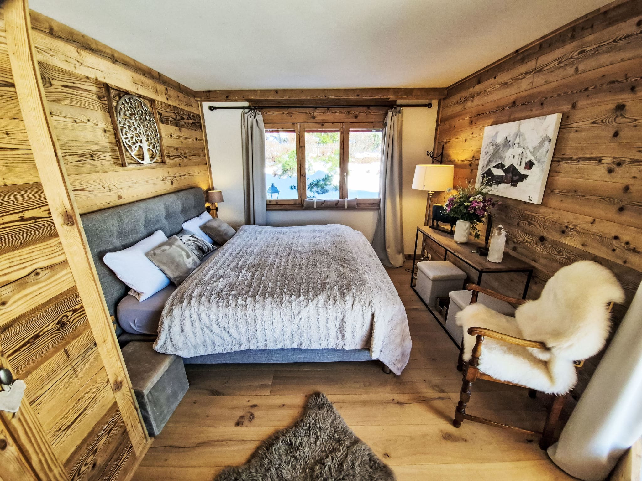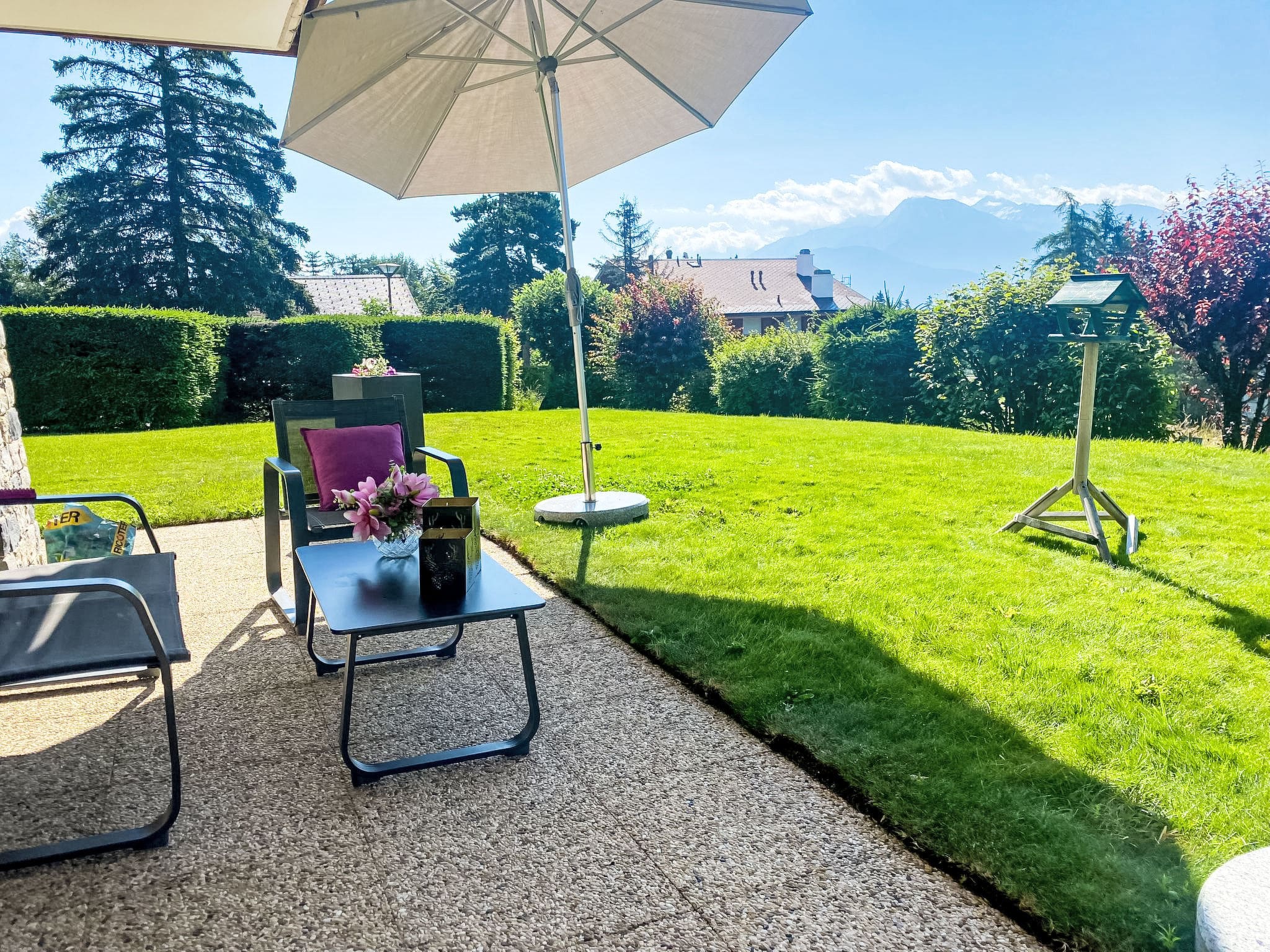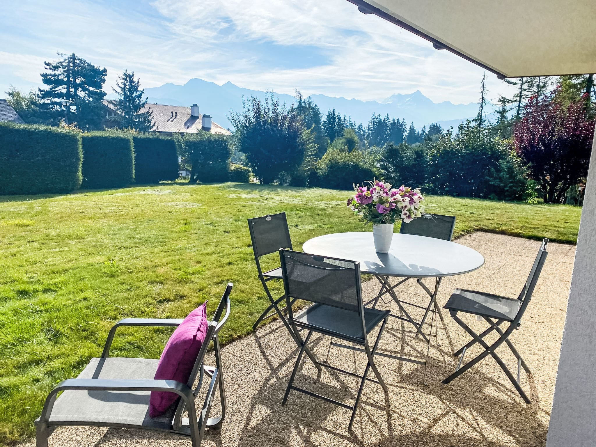 The chalet’s outdoor spaces are thoughtfully designed to maximise the stunning mountain setting. South and east-facing terraces provide sun-drenched spots for morning coffee and afternoon relaxation, while the private garden offers a tranquil lawn area perfect for children to play. Quality outdoor furniture and comfortable deck chairs create ideal vantage points for soaking in the panoramic Alpine vistas.