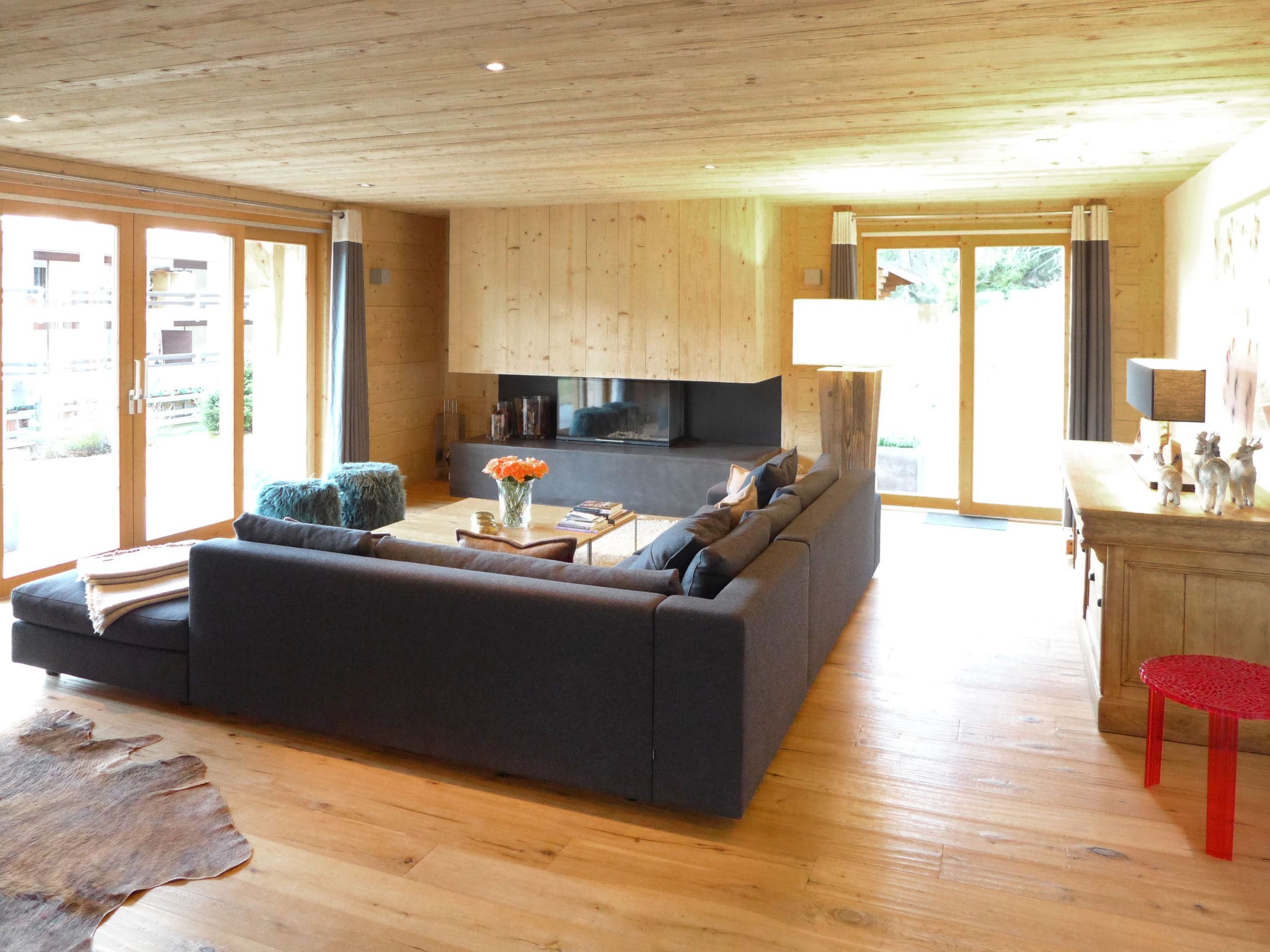 The chalet showcases contemporary alpine design across 230 square meters of thoughtfully arranged living space. The heart of the home features a spacious living and dining area anchored by a stunning open-hearth fireplace, where guests can gather after days on the mountain. Floor-to-ceiling windows flood the space with natural light while electric shutters offer privacy and ambiance control. The separate fully equipped kitchen boasts premium appliances including induction cooking, dishwasher, and specialized Swiss entertaining equipment like raclette grill and fondue sets.
