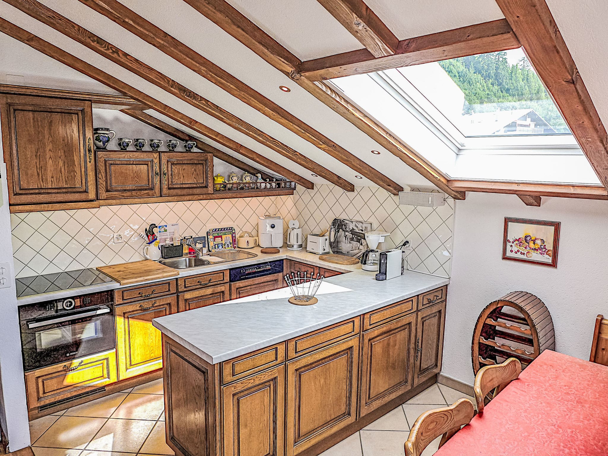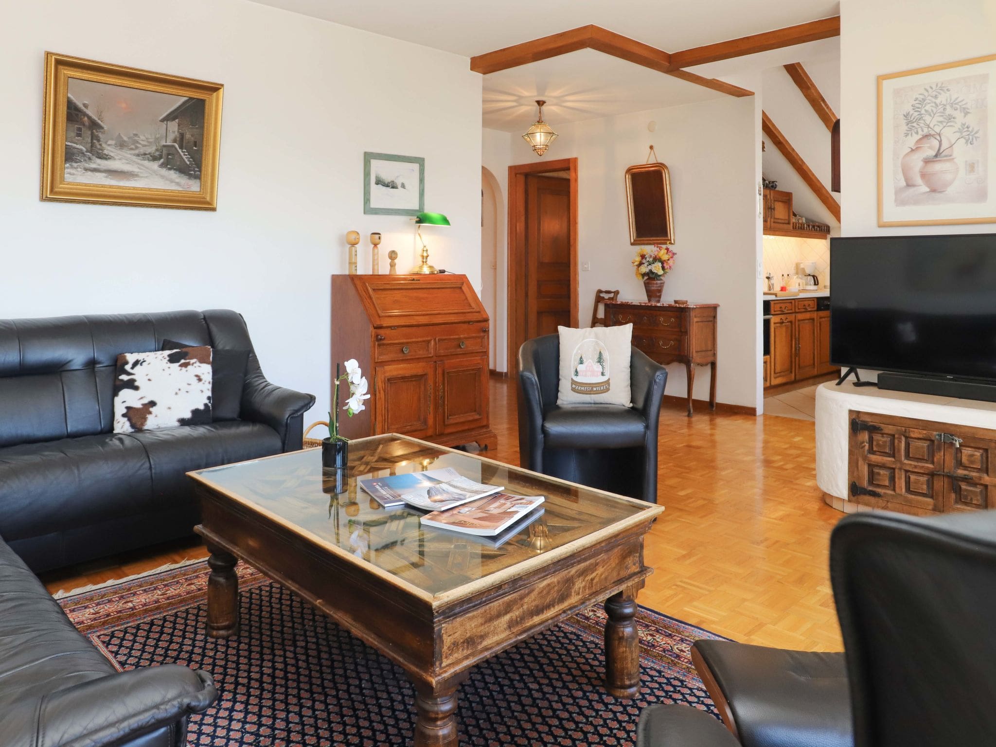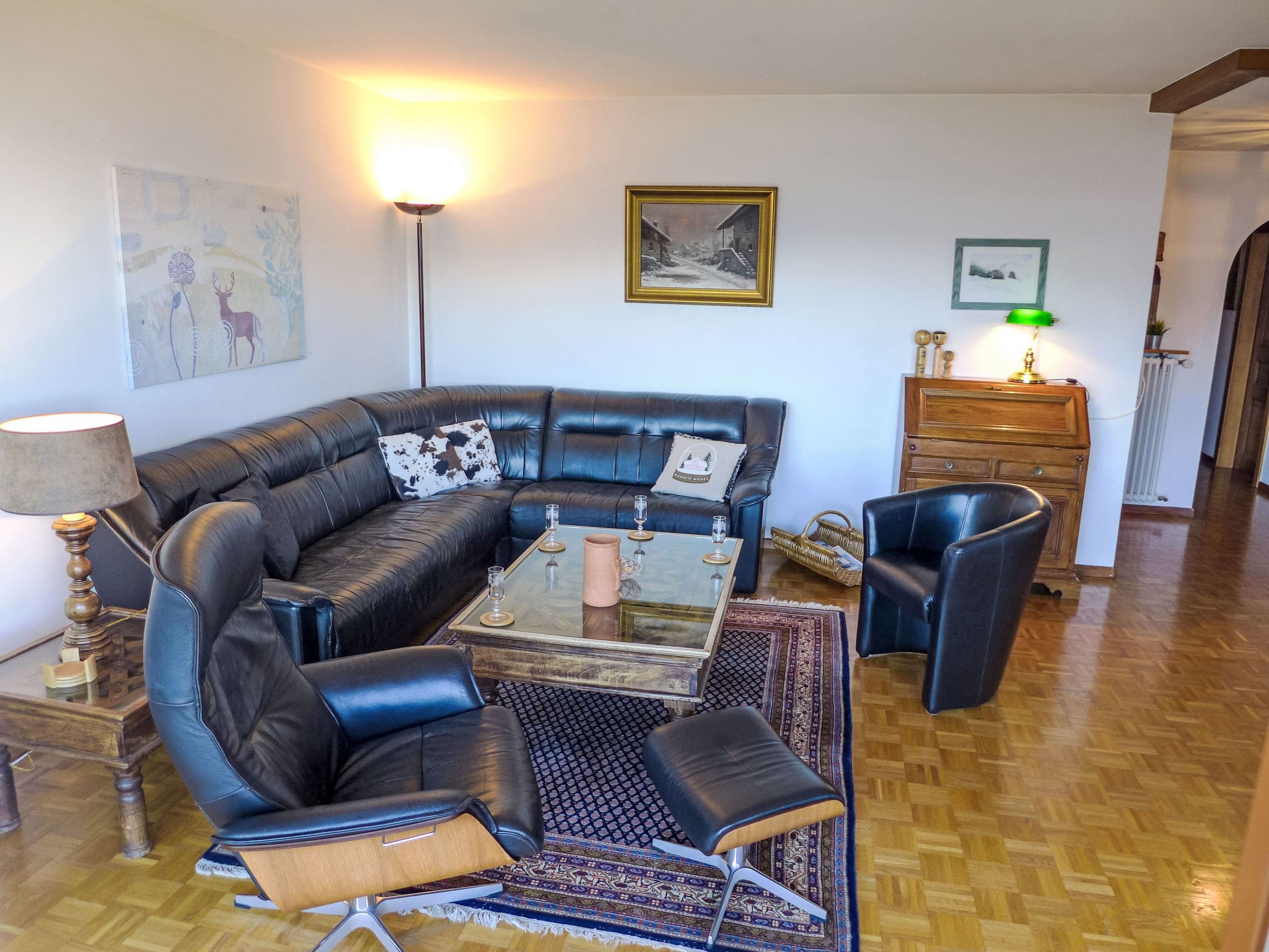 The 80-square-meter apartment showcases thoughtful design across a single level, featuring spacious living areas bathed in natural light from its south-facing position. The open-plan living room flows seamlessly onto a generous 15-square-meter balcony where guests can savour morning coffee while drinking in spectacular views of the surrounding peaks and valley below. The modern kitchen comes fully equipped with premium appliances including induction hobs, dishwasher, combination microwave, and specialized Swiss essentials like a raclette grill and fondue set for authentic Alpine dining experiences.