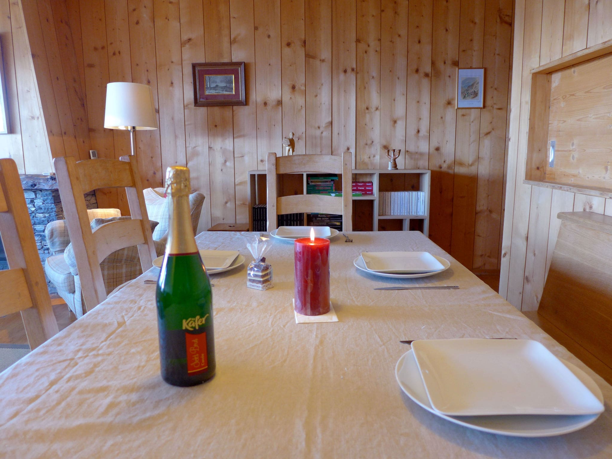 The thoughtfully designed interior showcases comfortable wooden furnishings that reflect the authentic Alpine aesthetic. The generous 23-square-meter living and dining area centers around a magnificent open-hearth fireplace, perfect for après-ski relaxation. French doors lead to the south-facing balcony, flooding the space with natural light while framing breathtaking mountain vistas. Entertainment amenities include a flat-screen cable TV, CD player, and DVD system.