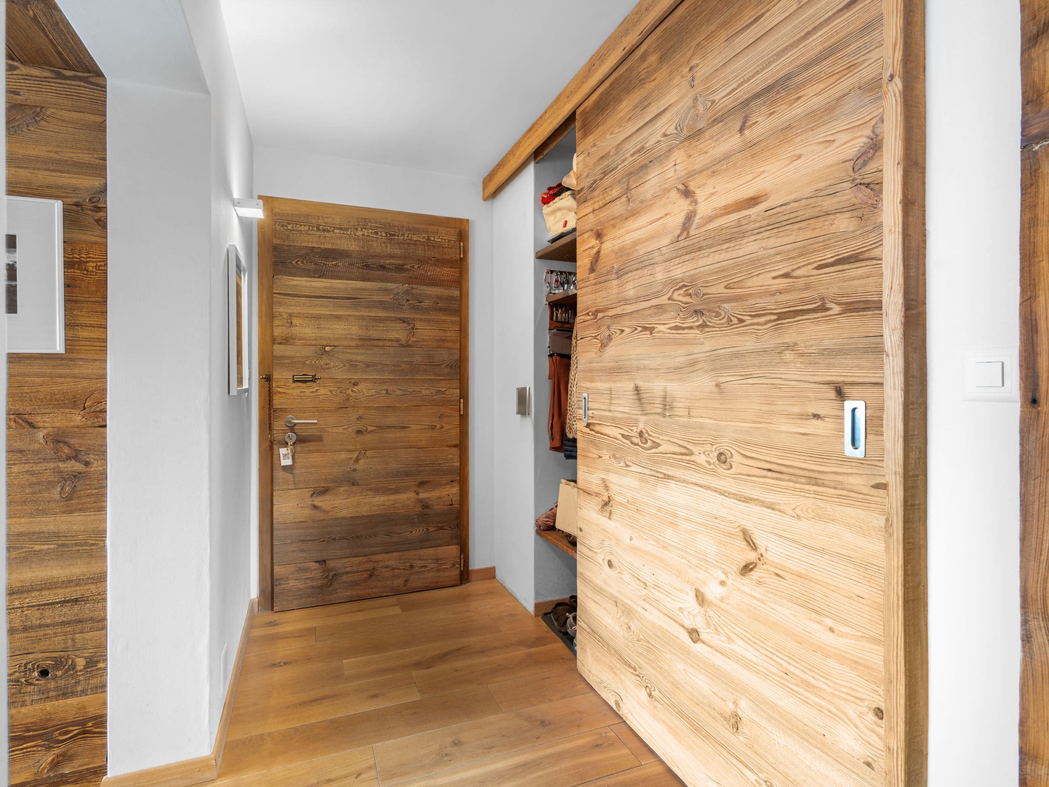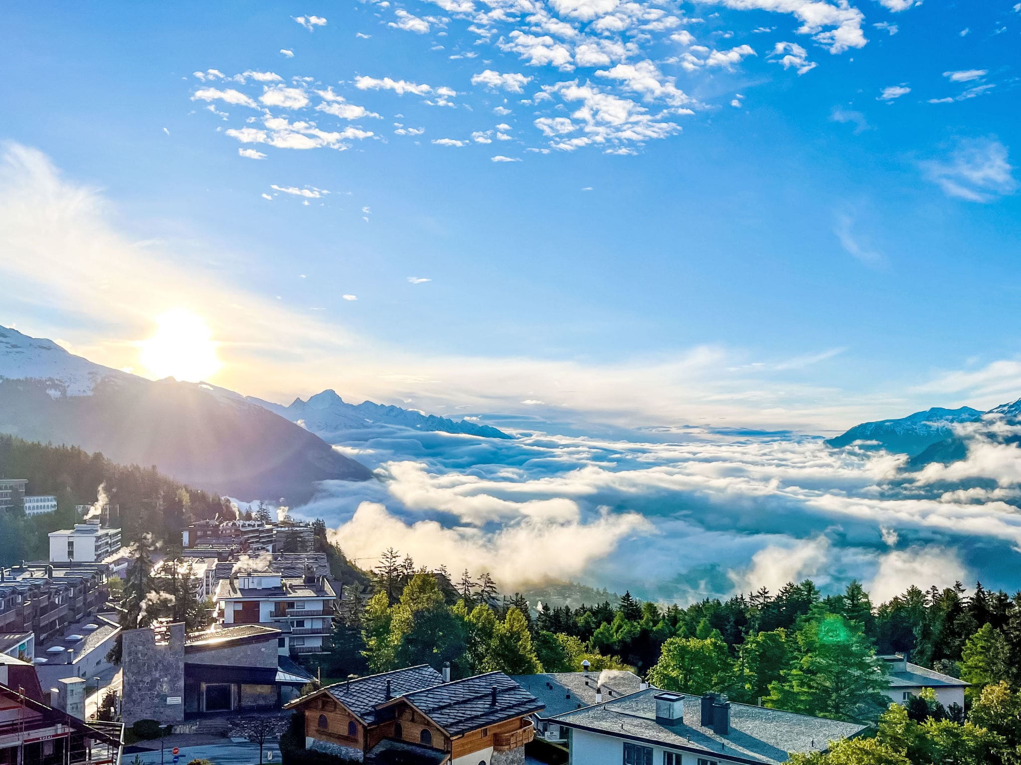 The apartment’s crowning glory lies in its impressive outdoor spaces, featuring both a south-facing terrace and north-facing balcony that capture magnificent panoramic views of the surrounding mountains, valley, and resort. The generous 18-square-metre terrace serves as an outdoor living room, complete with quality furniture and a portable barbecue for al fresco dining against the dramatic Alpine backdrop. Whether enjoying morning coffee while watching the sunrise paint the peaks golden, or evening aperitifs as the mountains glow in twilight, these outdoor spaces provide an unparalleled connection to the natural beauty of the Swiss Alps. The multiple aspects ensure sun throughout the day, while the elevated fourth-floor position guarantees unobstructed views across this spectacular landscape.