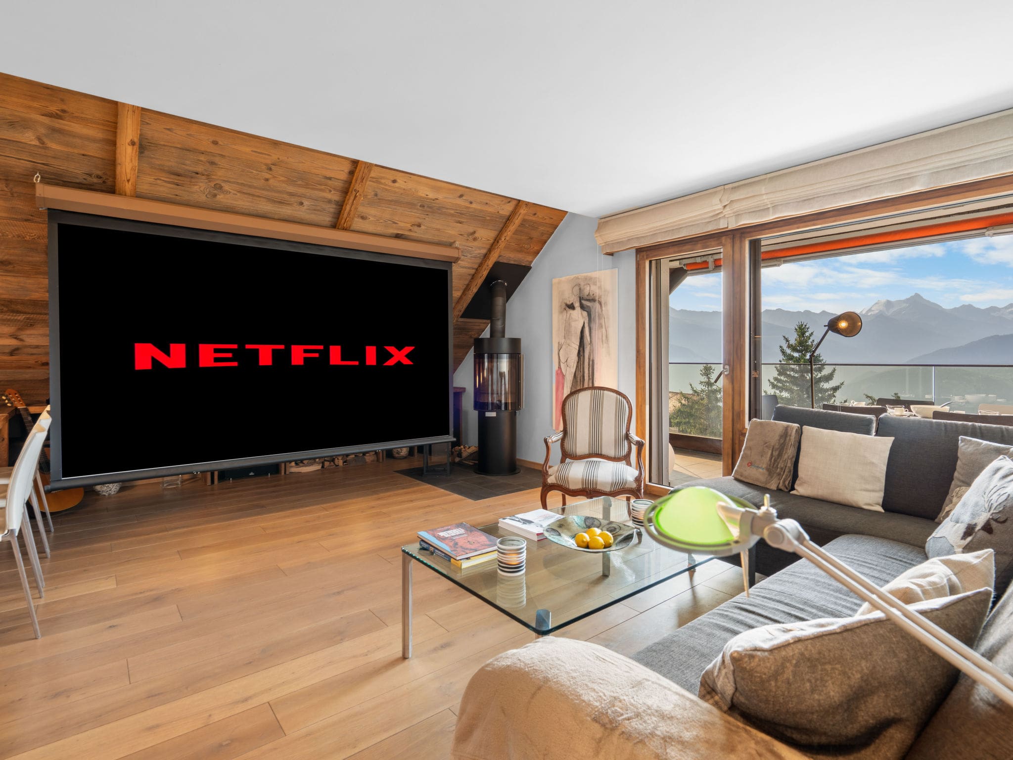 Fully renovated in 2015, this spacious 100-square-metre apartment showcases modern luxury across four beautifully appointed rooms on the fourth floor. The open-plan living and dining area features a striking Scandinavian wood stove, creating a cozy Alpine ambiance perfect for evening gatherings. High-end amenities include a home cinema system, DVD player, and electric shutters, while floor-to-ceiling windows frame spectacular mountain vistas. The master bedroom boasts a sumptuous French bed, en-suite bathroom with double basins, cable television, and direct terrace access. Two additional bedrooms provide flexible accommodation, including one with a clever wall-trunk bed design and balcony access. The fully equipped gourmet kitchen features premium appliances including induction hotplates, dishwasher, combination microwave, and specialized Swiss equipment like a raclette grill and fondue set for authentic Alpine dining experiences.