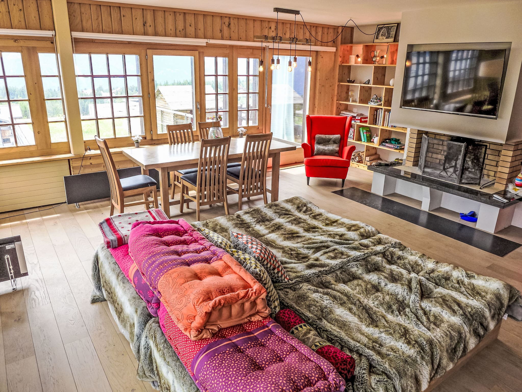 The fully equipped kitchen with fondue set encourages memorable shared meals, while the fireplace creates the perfect gathering spot for evening relaxation. Practical touches like ski storage, elevator access within the building, and nearby amenities including shops, restaurants and transport links make this an ideal choice for multi-generational holidays.