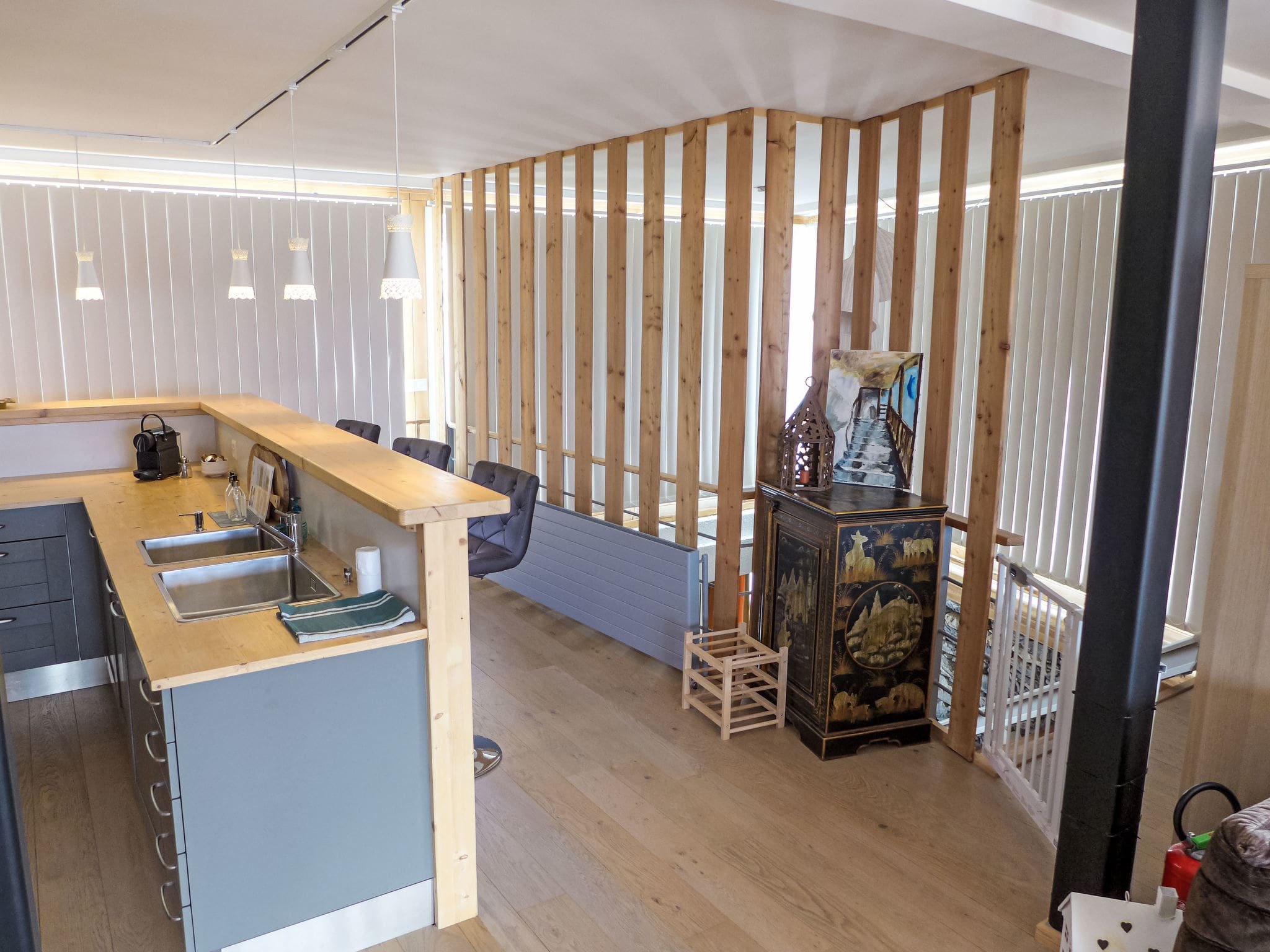 The chalet’s interior design perfectly captures the essence of contemporary alpine living. The spacious living and dining area features a magnificent open-hearth fireplace as its centrepiece, creating a warm and inviting atmosphere for gathering with family and friends. Floor-to-ceiling windows flood the space with natural light while showcasing the spectacular mountain panorama beyond. The open-plan kitchen comes fully equipped with premium appliances including an induction hob, dishwasher, microwave, and Nespresso coffee machine, plus a charming bar area perfect for entertaining.
