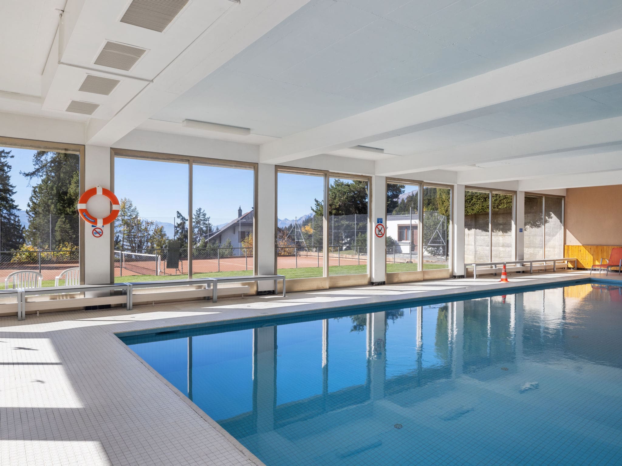 The residence provides access to exceptional shared facilities including a heated indoor swimming pool measuring 13 by 8 meters, available from December through October. Additional amenities include a tennis court, sauna available from 4 PM to 8 PM during high season, and dedicated ski storage with boot drying facilities.