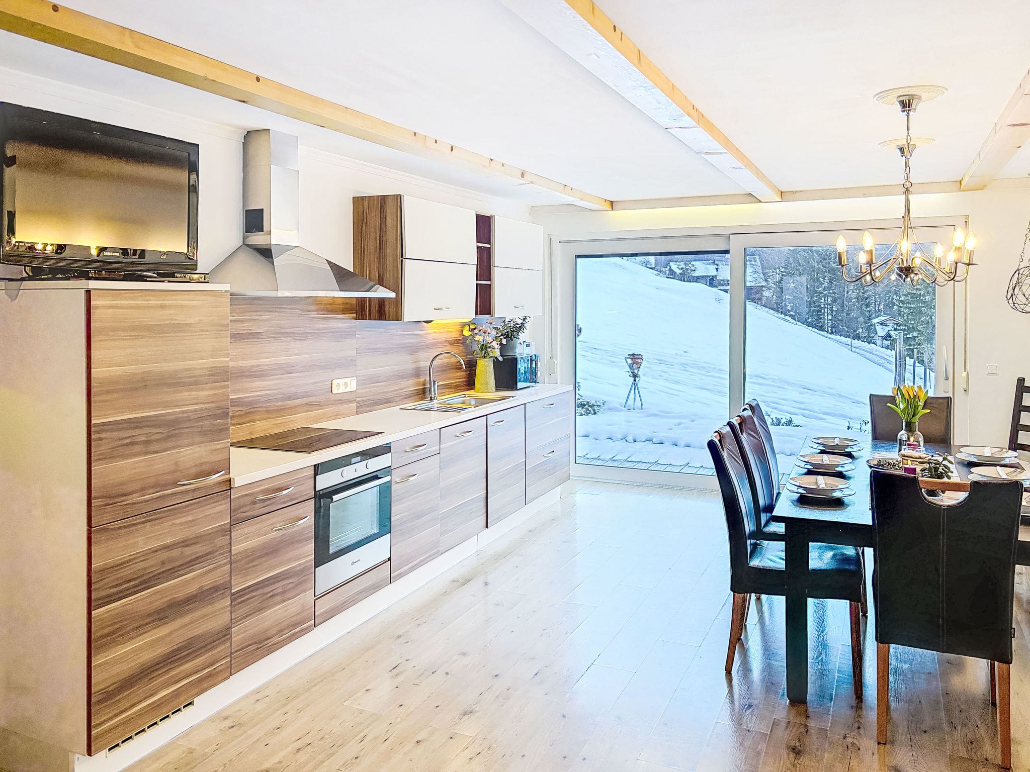 The 100-square-metre chalet showcases sleek modern design throughout its thoughtfully planned single-level layout. The heart of the home centres around an inviting living area featuring a stunning open fireplace and Scandinavian wood stove, creating a warm atmosphere perfect for evening relaxation. The open-plan design flows seamlessly into a fully equipped contemporary kitchen with premium appliances including induction cooking, dishwasher, and modern conveniences for effortless meal preparation.