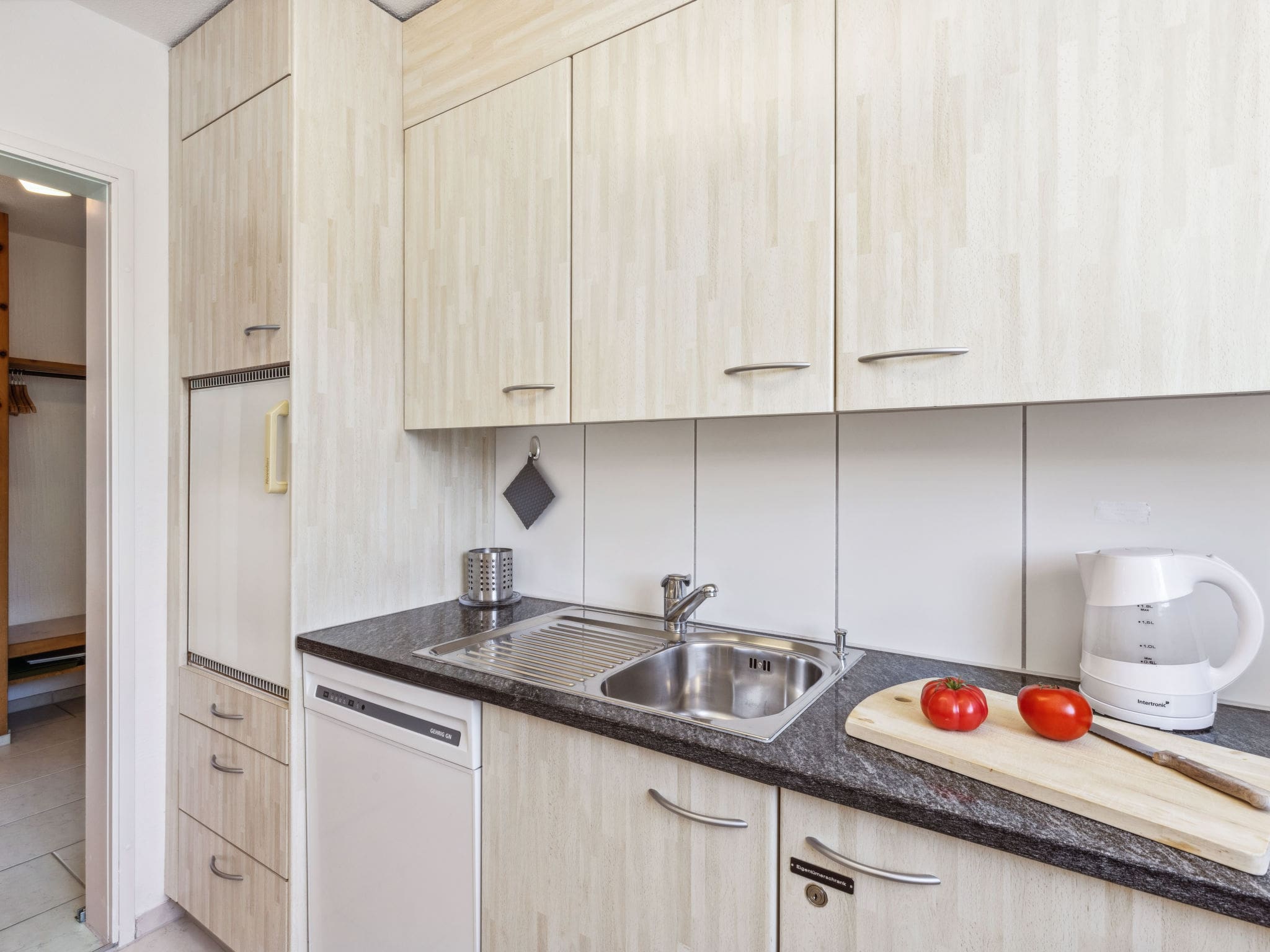 The fully equipped kitchen showcases modern appliances including a dishwasher, ceramic glass hob, and oven, perfect for preparing meals after active days on the slopes. The apartment features both a full bathroom with bathtub and a separate guest WC for added convenience. Double-glazed windows throughout ensure peaceful nights, while central heating maintains comfortable temperatures year-round.