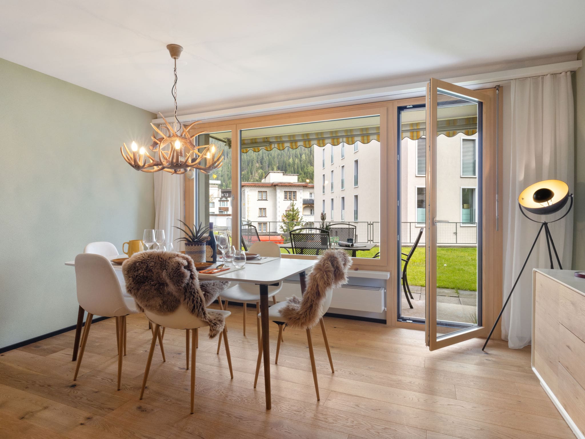 The property’s crowning feature is its expansive south-east facing terrace, where panoramic mountain views provide a breathtaking backdrop for morning coffee or evening aperitifs. Comfortable deck chairs invite relaxation while taking in the dramatic Alpine scenery, from the nearby Jakobshorn peaks to the distant summits that define the Davos landscape. The shared garden area offers additional outdoor space within the secure, fenced property grounds.