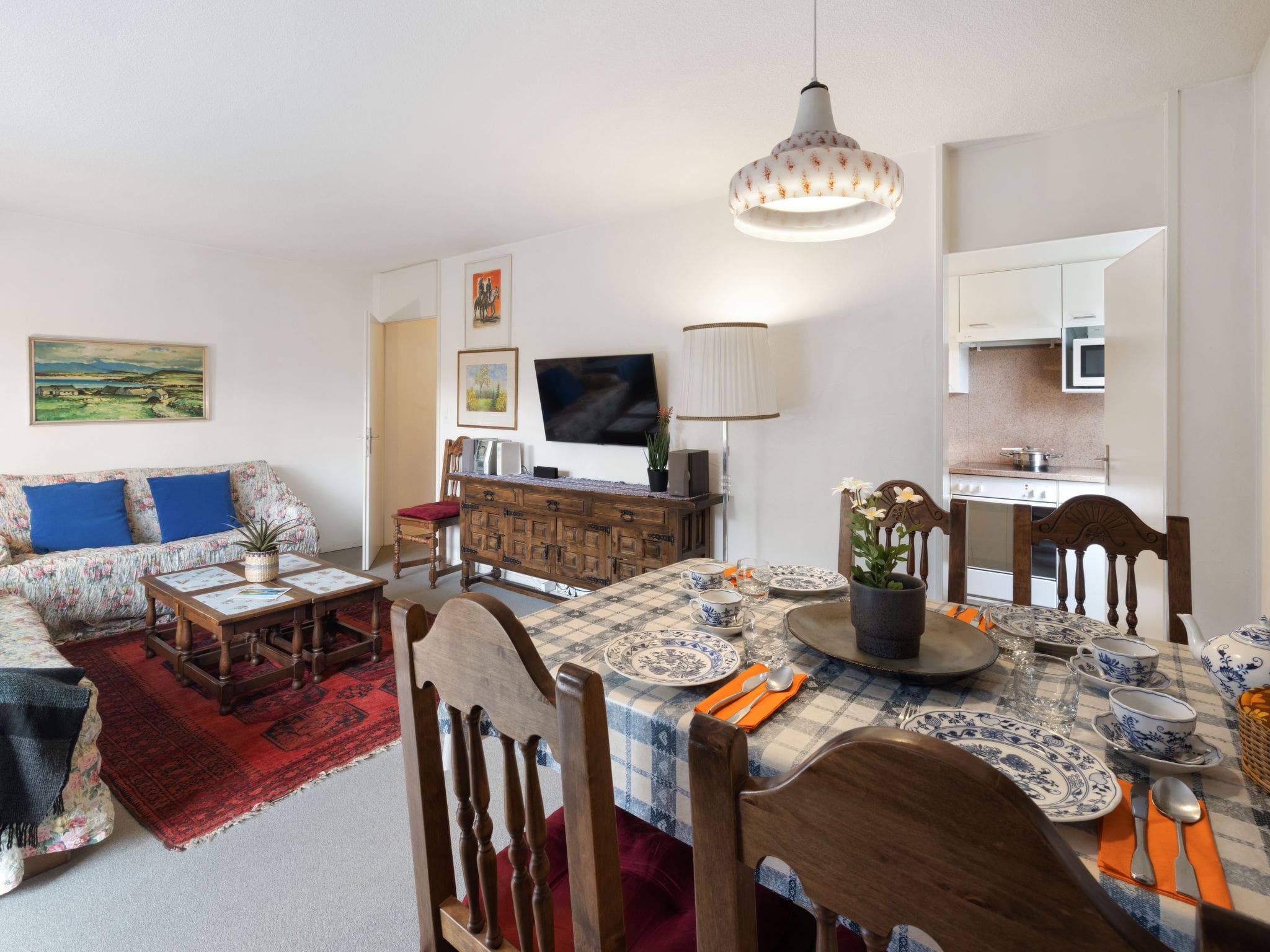 The 79-square-metre apartment showcases elegant wooden furnishings that capture the essence of traditional Swiss alpine design. The spacious living and dining area features contemporary entertainment systems including cable television, flat-screen display, and premium sound equipment, all opening onto an east-facing balcony that frames spectacular mountain vistas. The master bedroom contains a comfortable double bed, while the second bedroom offers twin single beds, making the space ideal for families or small groups of friends. The modern kitchen comes fully equipped with ceramic hob, dishwasher, microwave, and Nespresso coffee machine, ensuring effortless meal preparation. A well-appointed bathroom with shower, double basin, and quality fixtures completes the accommodation.