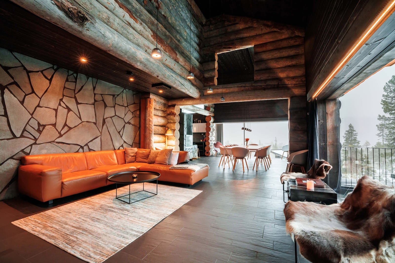 Step inside to discover a harmonious blend of contemporary elegance and rustic warmth. The open-plan living area features plush seating, a cozy fireplace, and panoramic windows that frame the stunning Lapland landscape. The fully equipped kitchen is perfect for preparing hearty meals, while the dining area invites family gatherings. Each bedroom is a serene retreat, with adaptable double beds that can be converted into twins upon request, ensuring flexibility for all guests. Five luxurious bathrooms offer spa-like comfort, enhancing your relaxation.