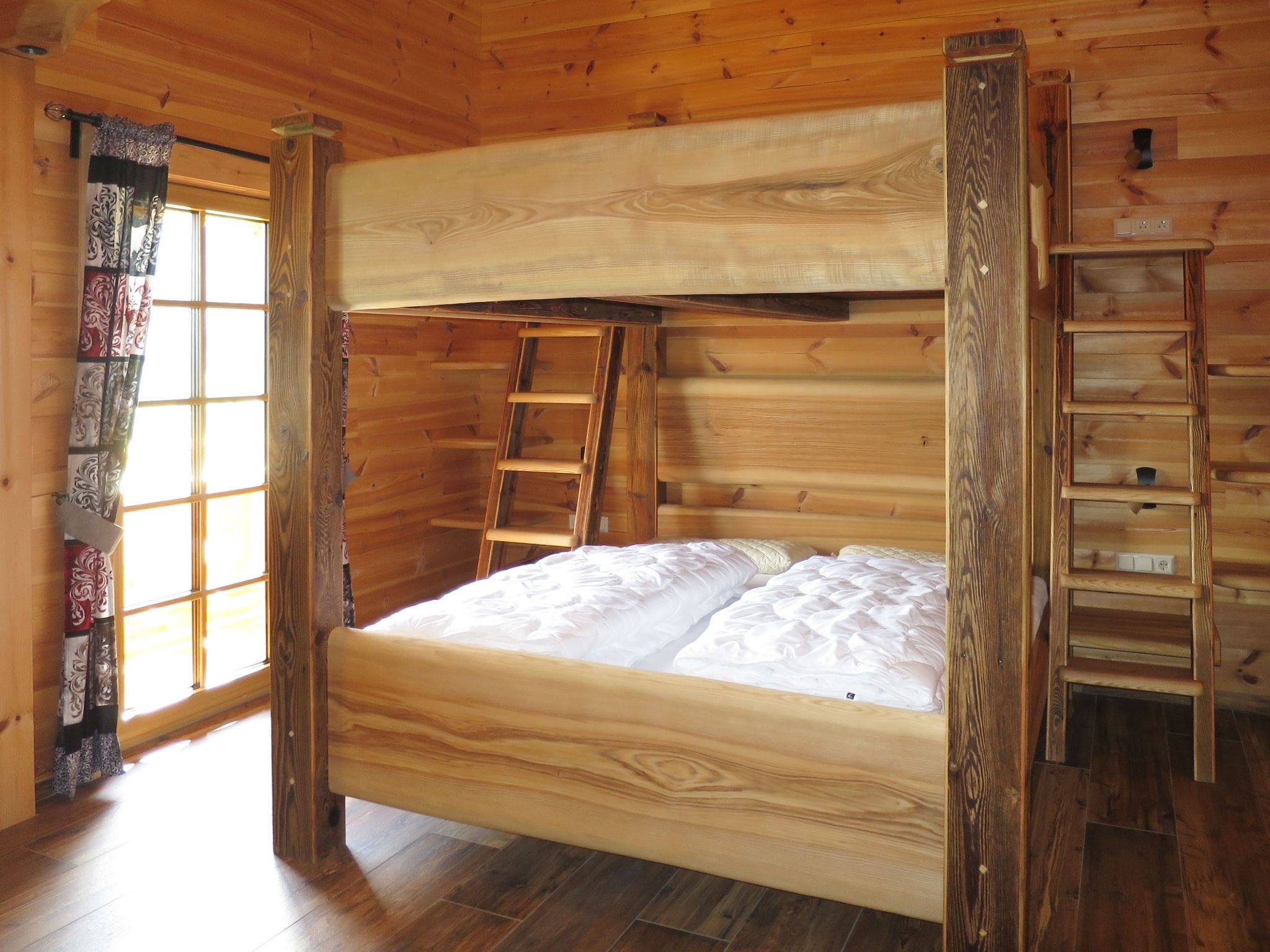 The upper floor houses four generous bedrooms, each featuring twin bunk beds and private shower rooms with satellite television. French doors from the upper level lead to a charming balcony where guests can savour morning coffee while drinking in the spectacular mountain panorama. The property’s crowning feature is its private sauna and infrared sauna facilities, providing the perfect way to unwind after days spent exploring the surrounding alpine landscape.