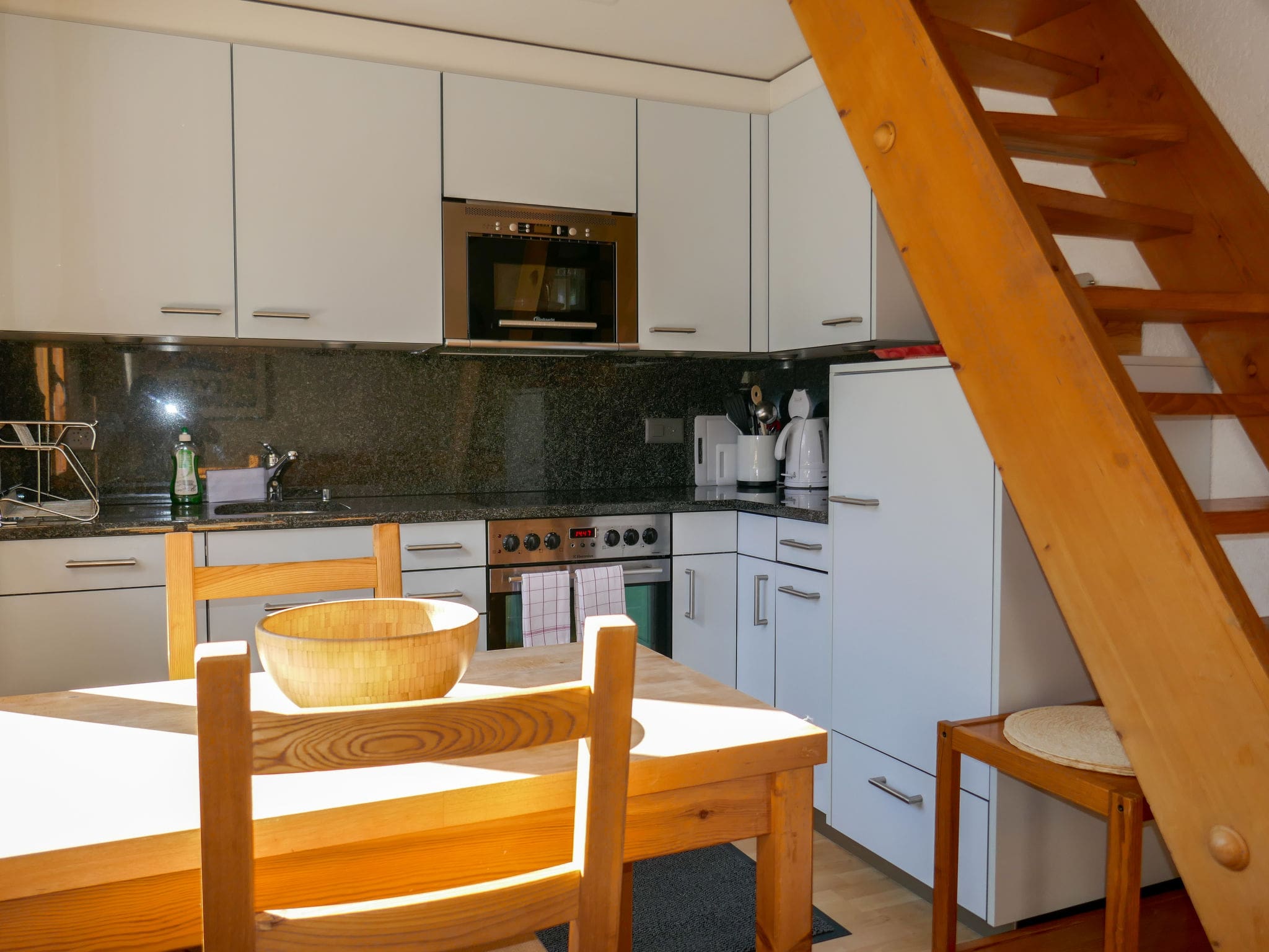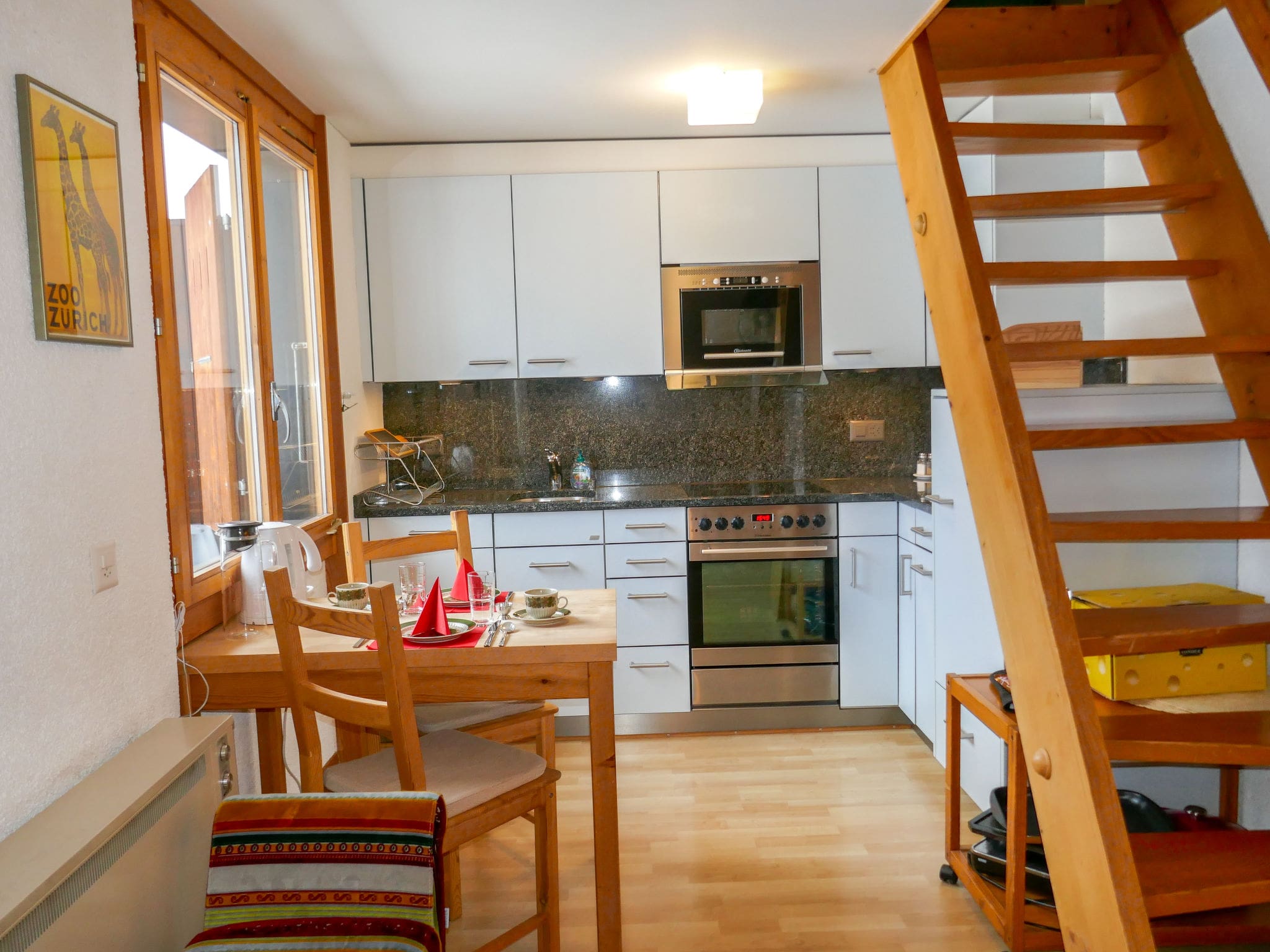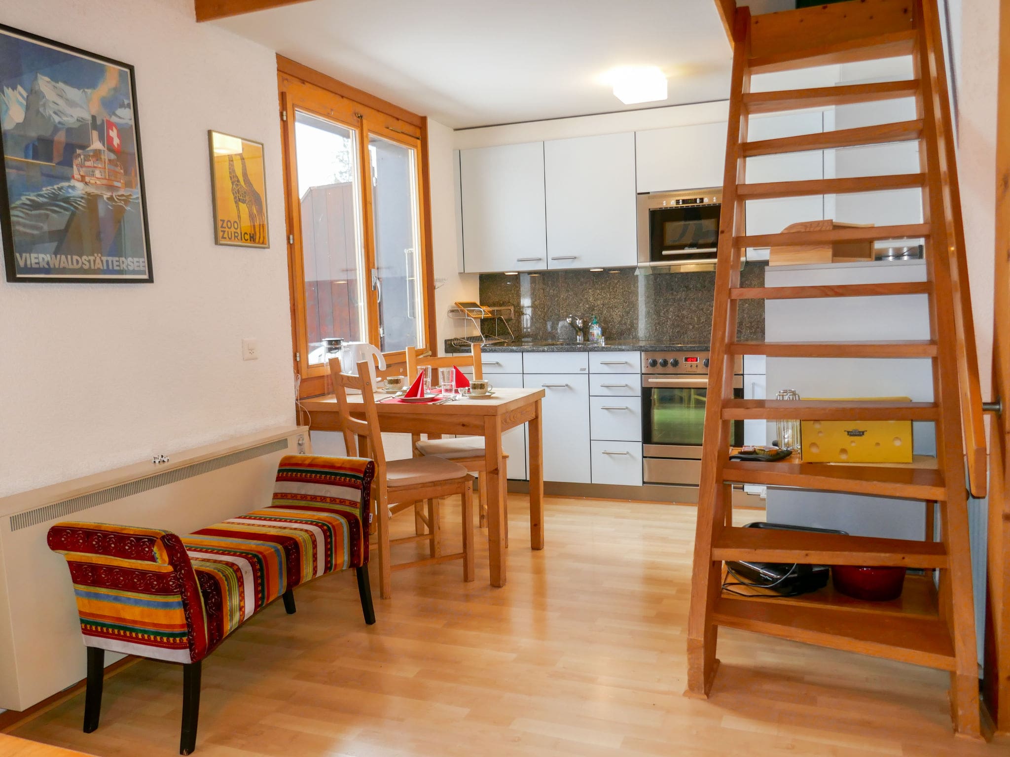 The 77-square-metre penthouse welcomes guests with cosy Scandinavian-inspired furnishings and an inviting wood-burning stove that creates the perfect atmosphere for après-ski relaxation. The open-plan living and dining area flows seamlessly onto a south-facing balcony where the dramatic mountain panorama unfolds before you, with the iconic Eiger dominating the skyline. Three comfortable bedrooms accommodate up to six guests, with two bedrooms on the main floor and a charming upper-level room tucked beneath sloping ceilings that add character and Alpine authenticity. The well-equipped kitchen features everything needed for self-catering, including a dishwasher, microwave, electric coffee machine, and traditional Swiss raclette grill and fondue set for authentic mountain dining experiences. Beautiful parquet floors throughout enhance the warm, welcoming atmosphere, while the single bathroom with efficient shower serves the property well.