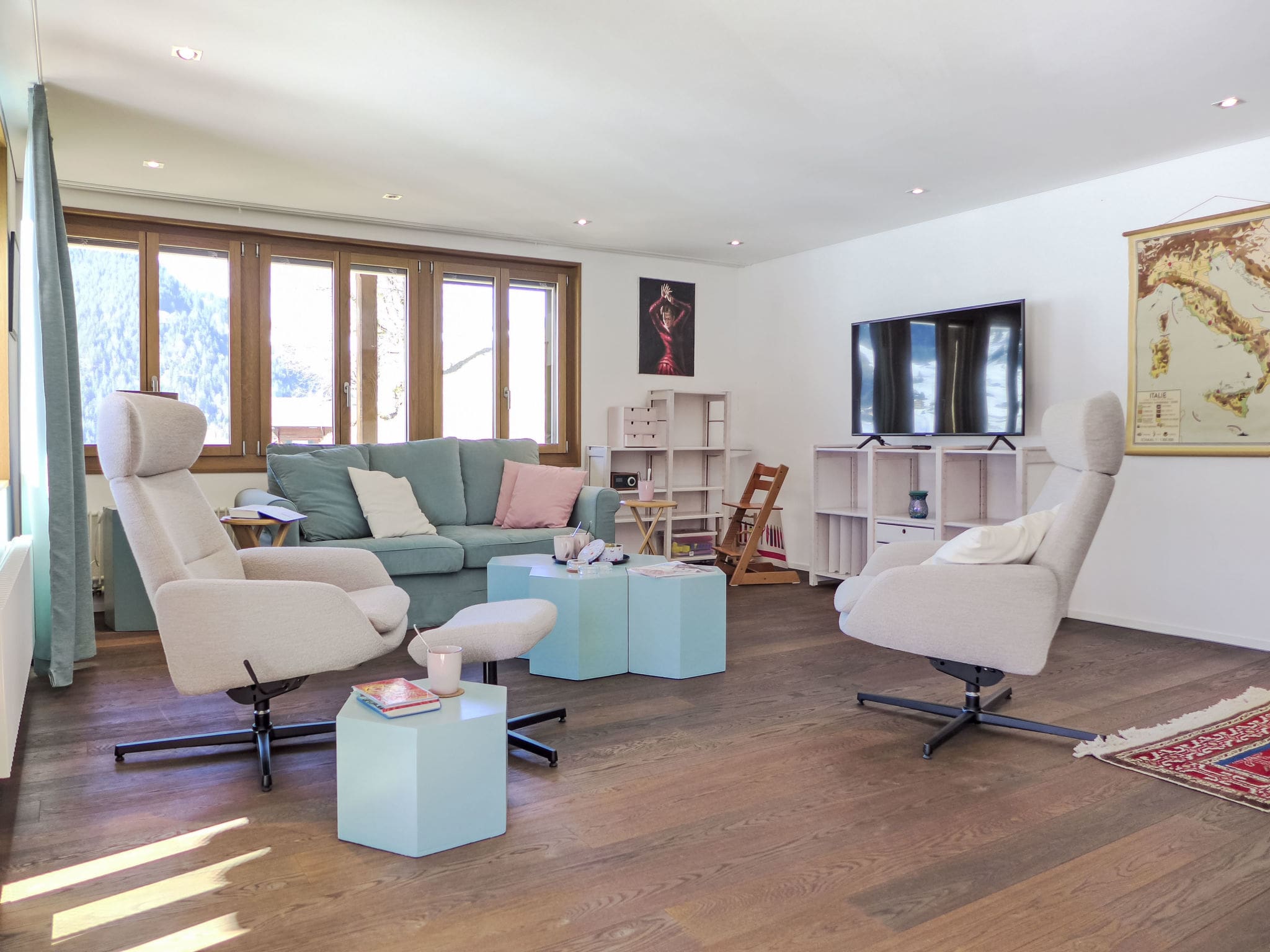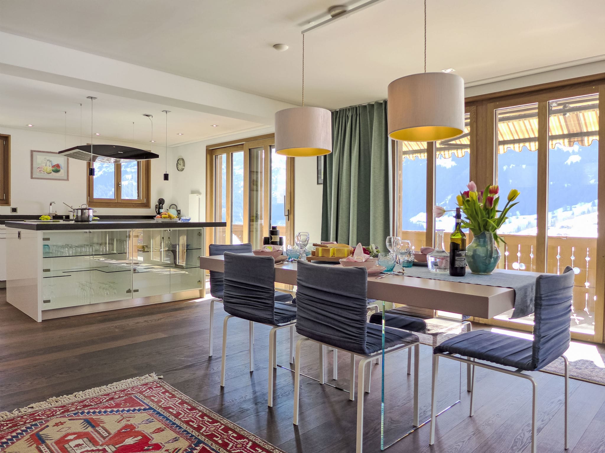 The 122-square-meter apartment occupies the first floor of Chalet Adlerhorst, featuring a spacious open-plan living and dining area with floor-to-ceiling panoramic windows that frame the dramatic Alpine landscape. The south-facing position ensures the space is bathed in natural light throughout the day, while tasteful furnishings and parquet flooring create an atmosphere of refined mountain luxury.