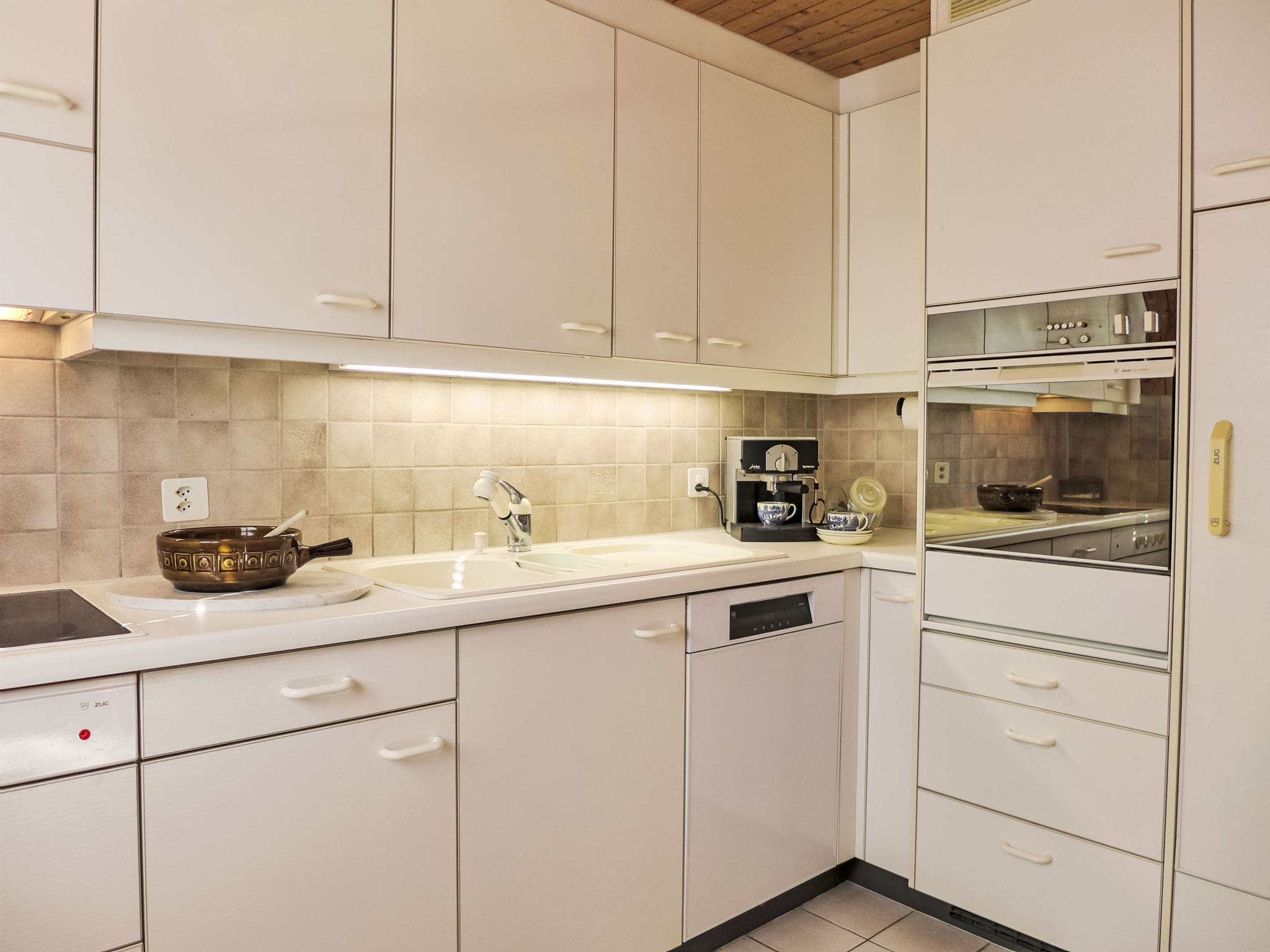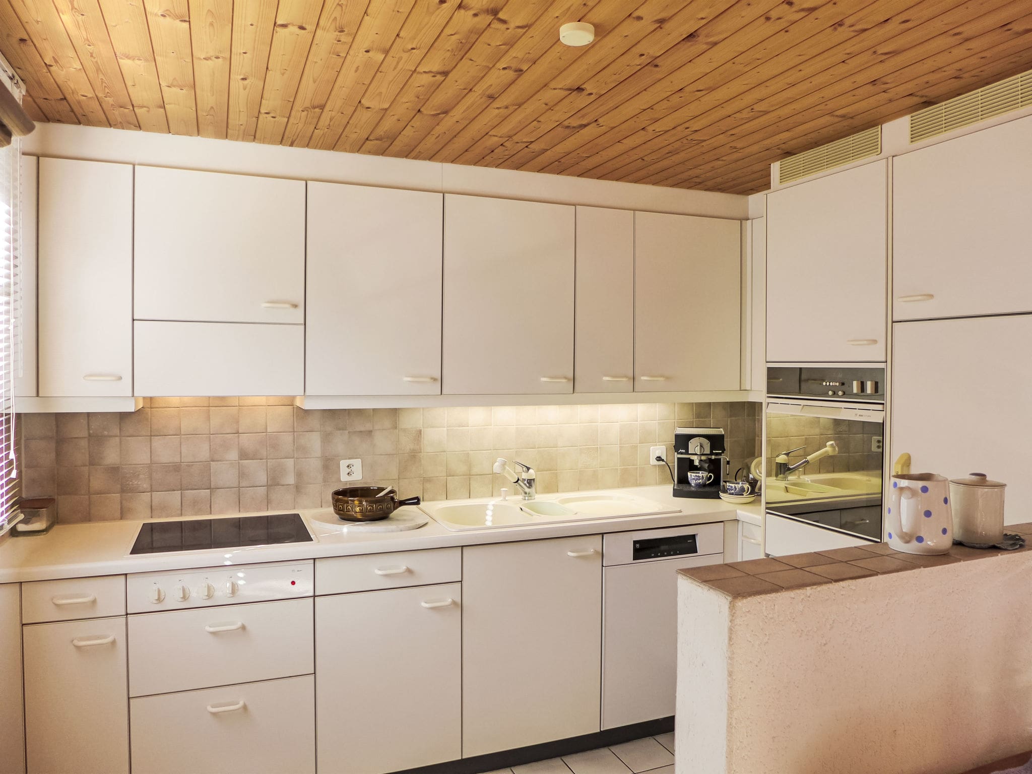 The rental includes WiFi, parking space, shared laundry facilities, ski storage, balcony furniture, and kitchen equipment including coffee machine, fondue set, and raclette grill for authentic Swiss dining experiences.