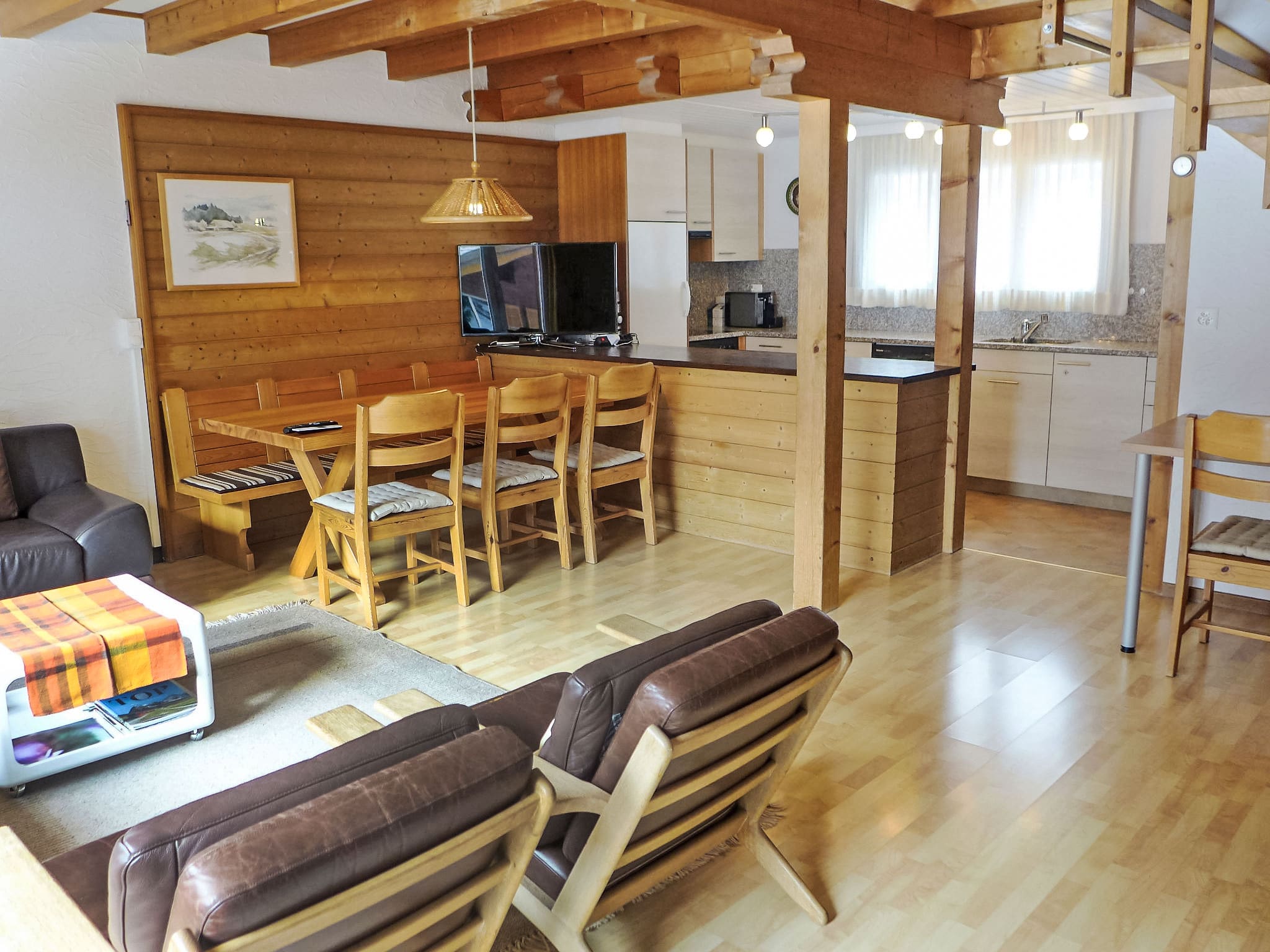 Spread across two thoughtfully designed levels, this 100-square-metre Alpine sanctuary features four comfortable bedrooms accommodating up to seven guests across two pristine bathrooms. The heart of the chalet centres around a welcoming living and dining area, where a traditional open-hearth fireplace creates the perfect atmosphere for evening gatherings after days spent on the slopes or exploring mountain trails. The space flows seamlessly onto a private south-facing balcony, where morning coffee becomes a ritual enhanced by magnificent mountain panoramas. The fully equipped open kitchen features modern amenities including a dishwasher, ceramic glass hob, and electric coffee machine, making meal preparation a pleasure rather than a chore. On the upper level, sloping ceilings add character to the bedrooms, each offering peaceful mountain views and comfortable sleeping arrangements ranging from single beds to a French double bed.
