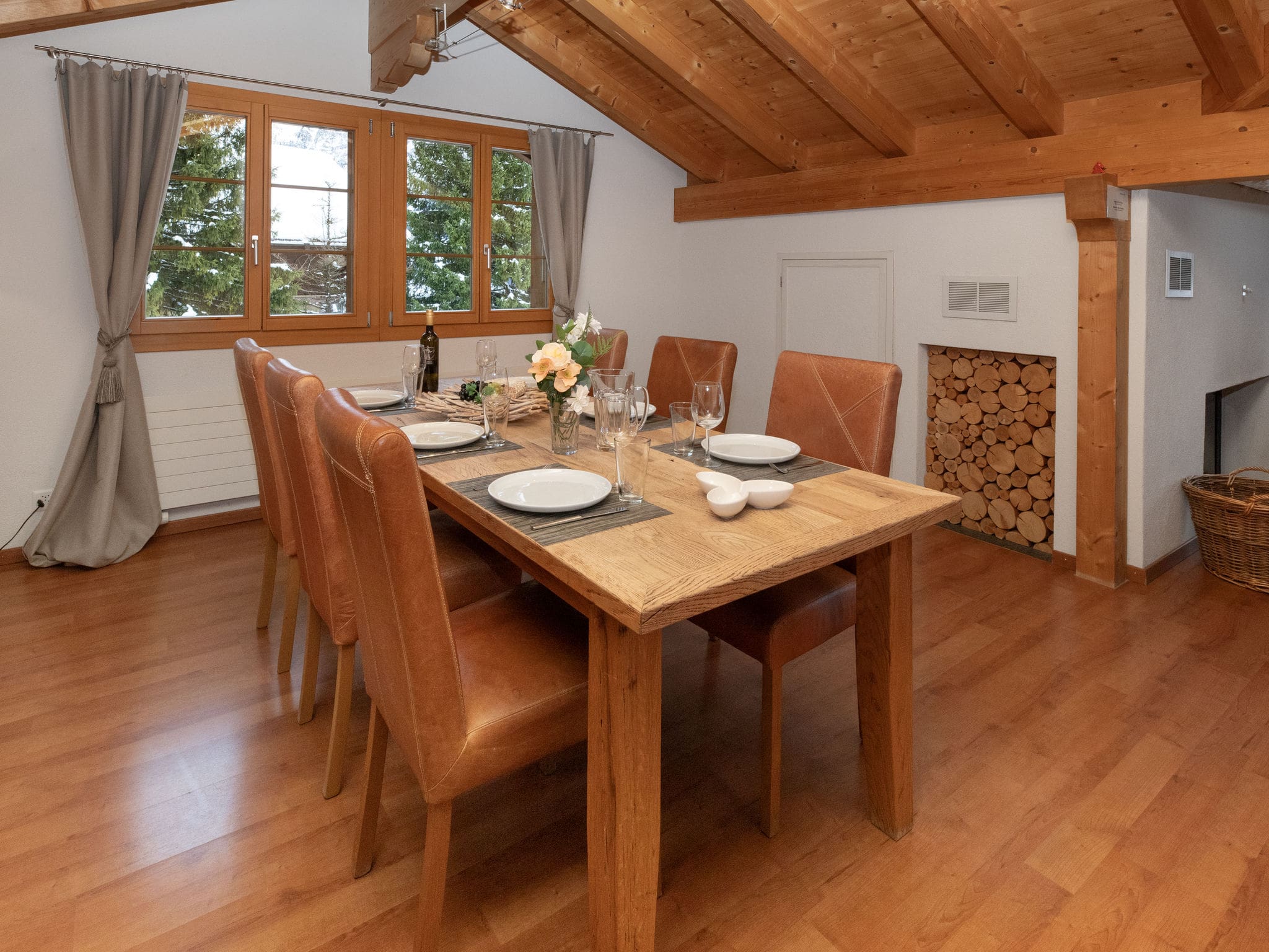 Spanning 130 square metres across the top floor of the distinguished Chalet Tuffstein building, this traditional Alpine apartment combines authentic mountain charm with modern comfort. The open-plan living and dining area features a magnificent open-hearth fireplace and sloping timber ceilings that create an intimate, cosy atmosphere perfect for gathering after days exploring the mountains. Large south-facing windows flood the space with natural light while framing spectacular views of the Eiger, valley, and surrounding Alpine peaks.