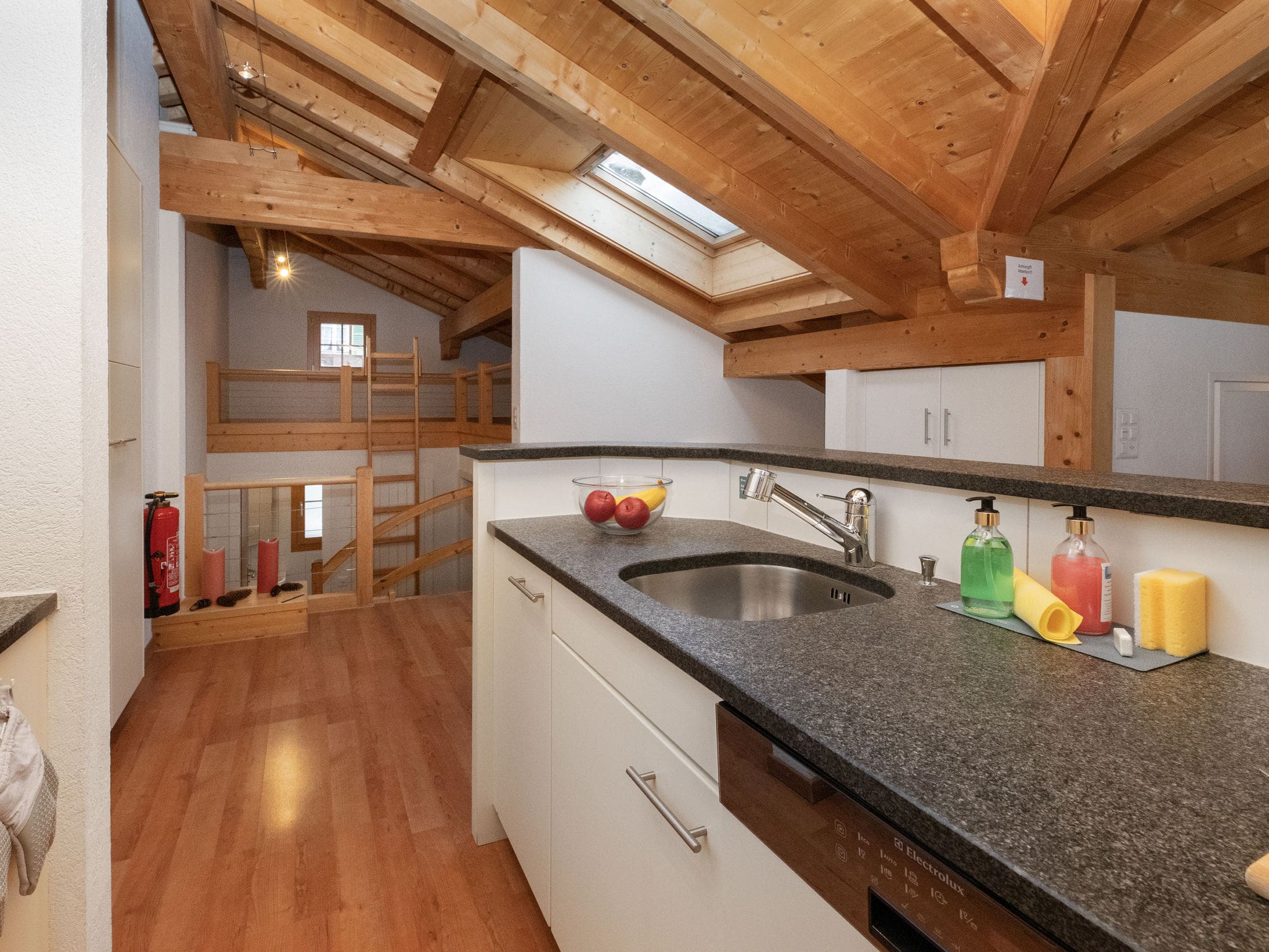 The accommodation thoughtfully provides sleeping arrangements for up to five guests across three well-appointed bedrooms. The master bedroom features a comfortable double bed, while the second bedroom offers twin beds, and a smaller third room provides a single bed – ideal for families or groups seeking flexible sleeping options. The open kitchen comes fully equipped with premium appliances including an oven, dishwasher, ceramic hob, and Nespresso coffee machine, plus traditional Swiss touches like a raclette grill and fondue set for authentic Alpine dining experiences.