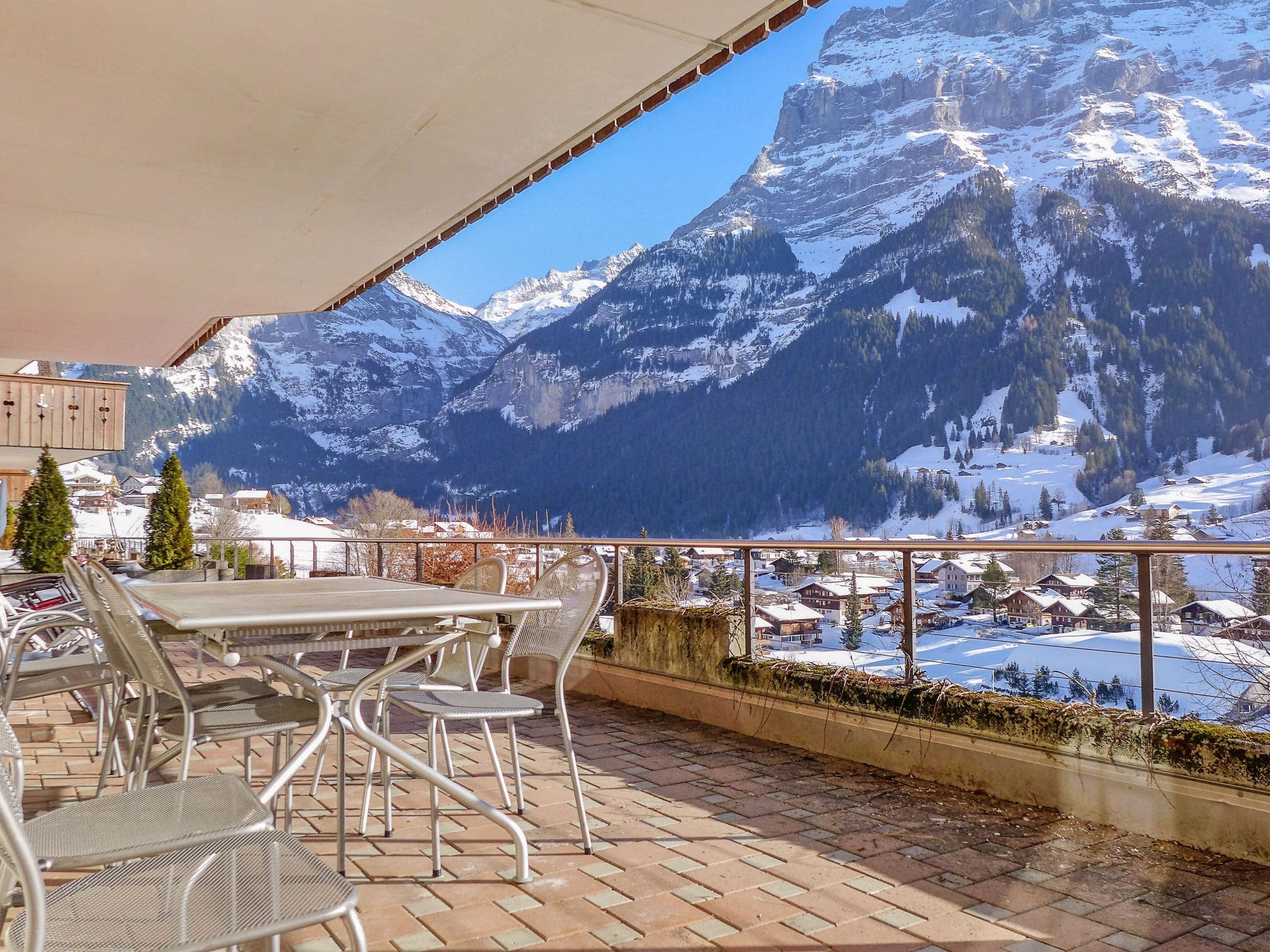 The property’s crown jewel is its magnificent 80-square-meter terrace, perfectly positioned to capture both southern and western sun exposure. Furnished with quality outdoor furniture and two deck chairs, this expansive space offers uninterrupted views of the surrounding peaks and the iconic Eiger North Face. The private garden area provides additional outdoor space for relaxation, while the sunny position ensures optimal conditions for al fresco dining and mountain gazing throughout the seasons.