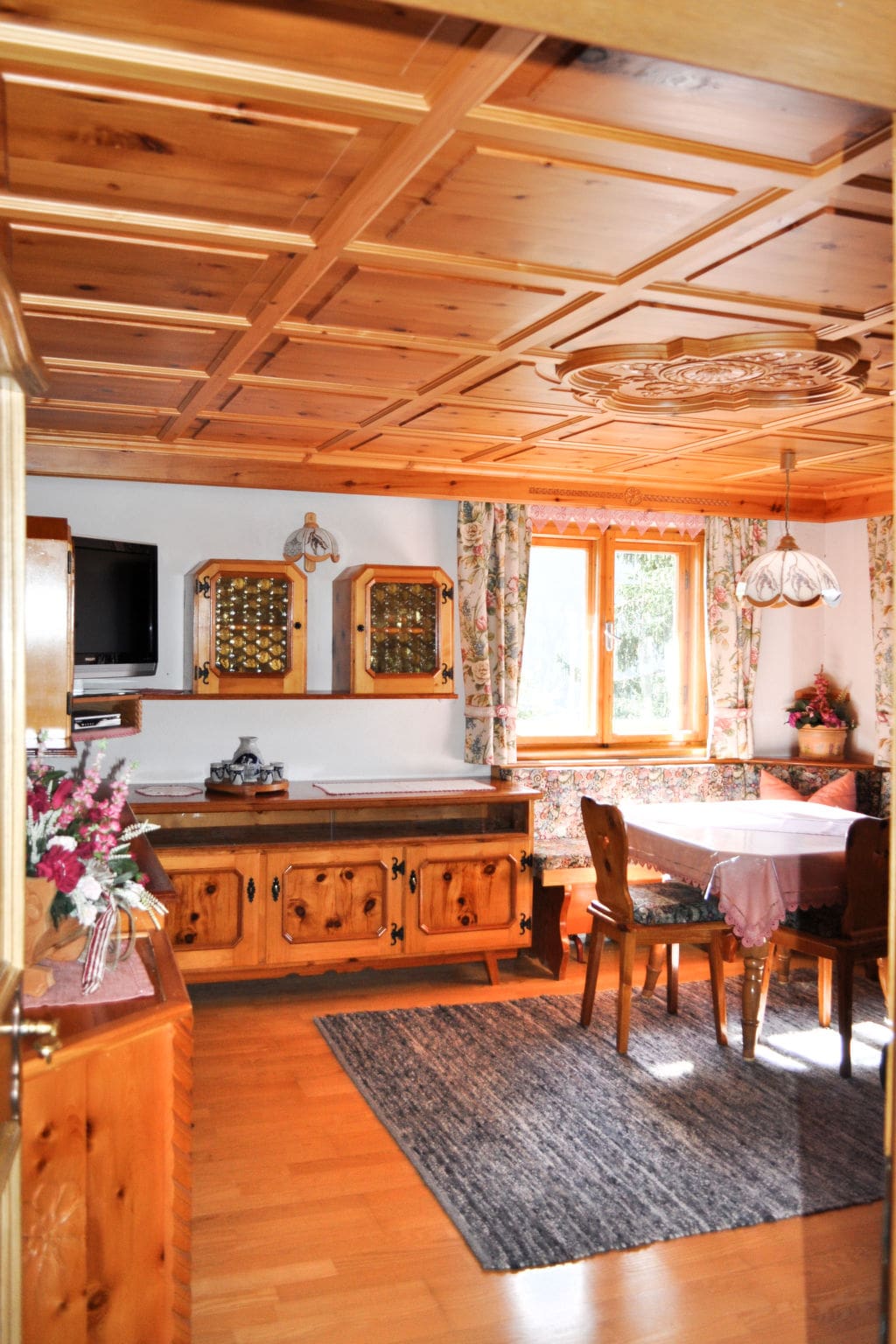 The property’s elevated position provides breathtaking vistas across the Paznaun Valley, with the dramatic peaks of the Silvretta mountain range forming a spectacular backdrop. During summer months, guests can enjoy the furnished terrace and private garden, perfect for morning coffee or evening aperitifs while watching the alpenglow paint the surrounding peaks. The private balcony accessed from the upper floor offers an intimate space to appreciate the changing mountain light throughout the day.