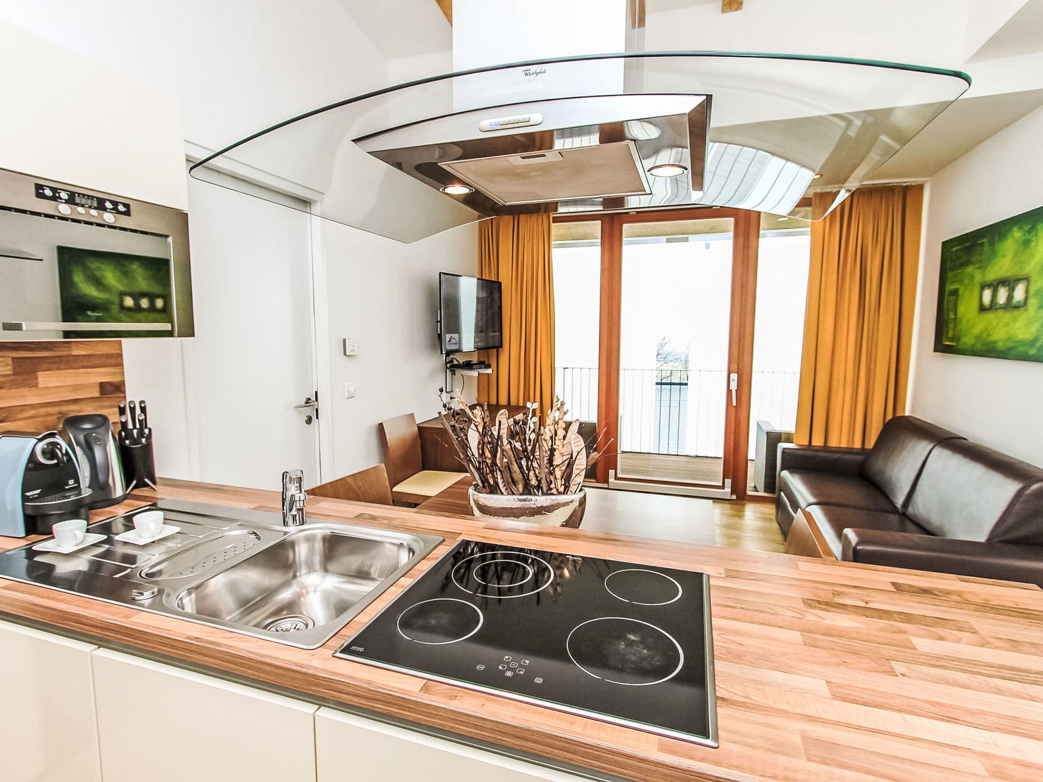 This thoughtfully designed 40-square-meter apartment features bright, contemporary furnishings that create a warm and inviting atmosphere. The open-plan living area seamlessly combines dining and relaxation spaces, anchored by a comfortable double sofa bed that transforms the room for additional guests. The separate double bedroom provides a peaceful retreat with satellite television and stunning mountain vistas through large windows. The fully equipped kitchen includes premium appliances including a Nespresso coffee machine, dishwasher, and everything needed for preparing meals after days on the mountain. The bathroom features modern fixtures with both bathtub and bidet, while underfloor heating ensures year-round comfort throughout the property.