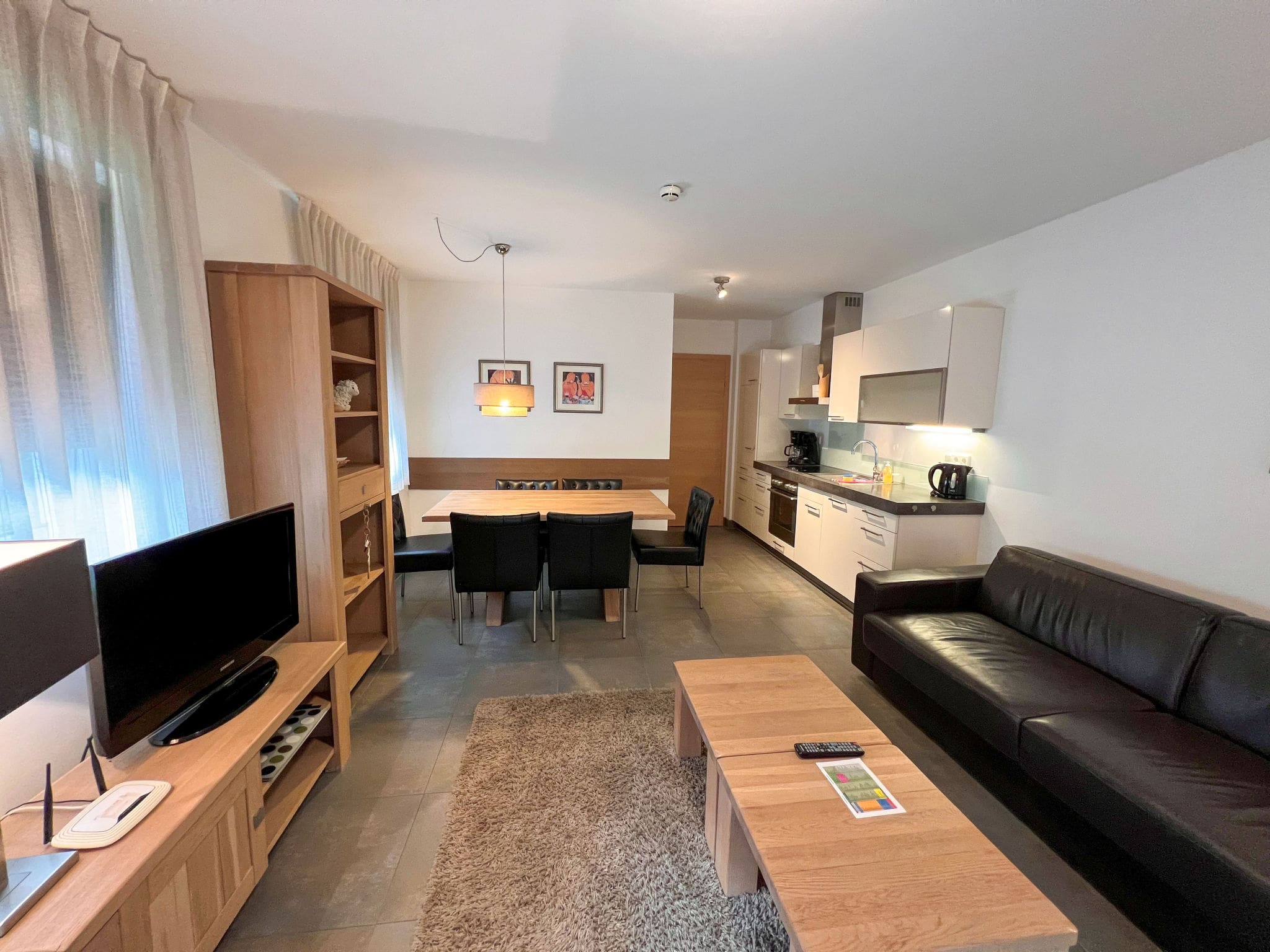 Spanning 57 square metres of thoughtfully designed living space, this ground-floor apartment showcases modern alpine elegance throughout. The open-plan living and dining area features a comfortable seating arrangement and flat-screen television, with floor-to-ceiling windows framing spectacular mountain vistas. The fully equipped kitchen includes premium appliances including a ceramic hob, oven, dishwasher, and electric coffee machine, perfect for preparing meals after days spent on the slopes or exploring the surrounding peaks.