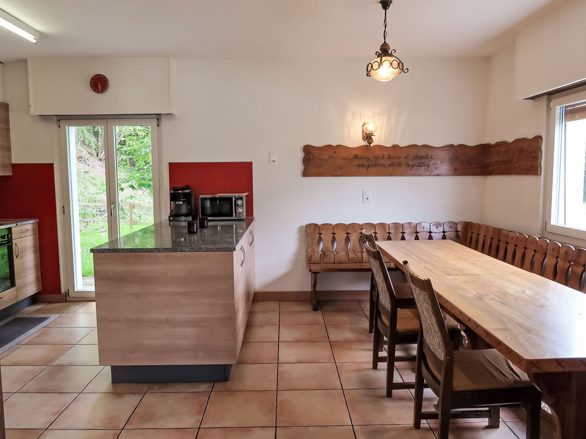 The chalet welcomes you with practical yet comfortable interiors that celebrate traditional Alpine charm while providing modern conveniences. The heart of the home lies in the spacious living and dining area, where guests can gather around the cable television or step directly onto the garden terrace to breathe in the crisp mountain air. The open kitchen stands ready for culinary adventures, equipped with everything needed for memorable meals including a dishwasher, ceramic glass hob, microwave, electric coffee machine, and even a raclette grill and fondue set for authentic Swiss dining experiences.