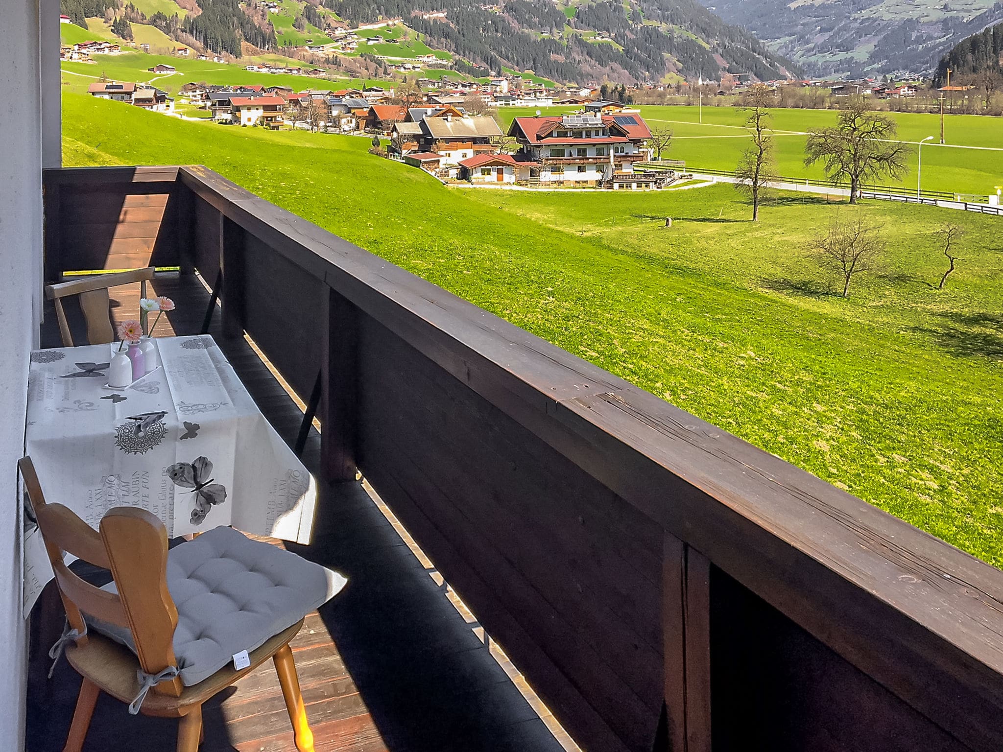 The chalet’s elevated position provides beautiful mountain surroundings and direct access to outdoor adventures. Two furnished balconies offer peaceful spots to enjoy morning coffee or evening relaxation, complete with deck chairs for optimal alpine views. The property features a shared courtyard area and dedicated parking on the premises, including an electric vehicle charging station for environmentally conscious travelers. A ski boot dryer and storage room cater specifically to winter sports enthusiasts, while the location provides immediate access to hiking trails, including a scenic route to nearby Zell that begins right at the front door.