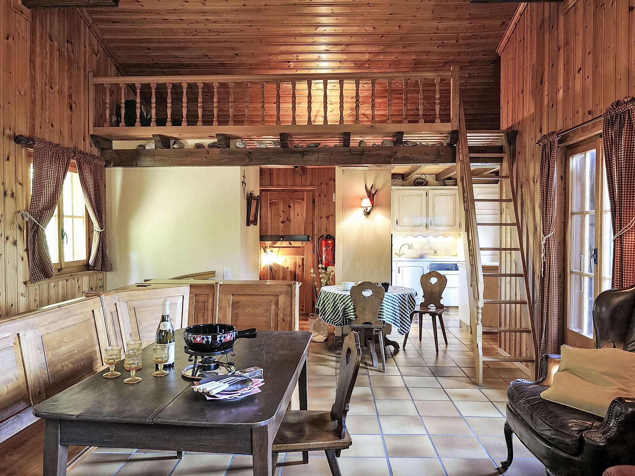 Spread across three thoughtfully designed levels, this 110-square-meter chalet maximizes both space and views. The heart of the home features an open-plan living and dining area with satellite television and a traditional paraffin heater, creating a cozy atmosphere for evening relaxation. The fully equipped open kitchen includes modern appliances, dishwasher, ceramic hob, microwave and oven, plus a traditional Swiss fondue set for authentic Alpine dining experiences. French doors from the main living space lead directly to the panoramic terrace, seamlessly blending indoor and outdoor living.