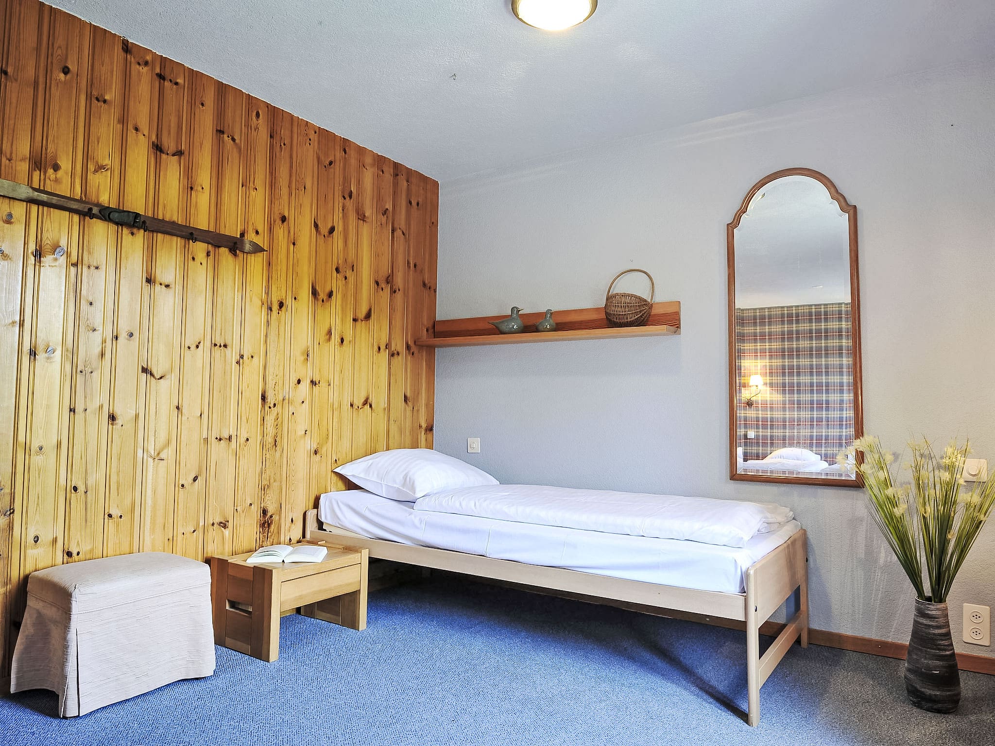 The sleeping quarters are positioned on the lower level, featuring three comfortable bedrooms accommodating up to six guests. The master bedroom includes a spacious double bed, while two additional rooms offer flexible sleeping arrangements with single and triple bed configurations. A full bathroom with both bath and shower facilities serves all bedrooms, complemented by a separate guest WC on the main level. Throughout the chalet, comfortable furnishings and thoughtful touches create a welcoming atmosphere that balances rustic charm with modern convenience.