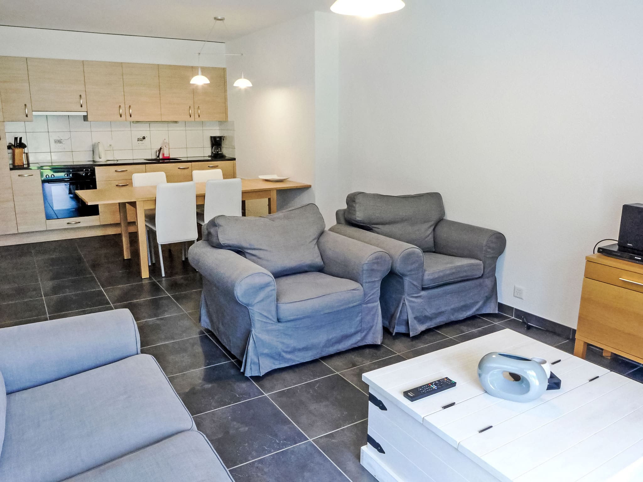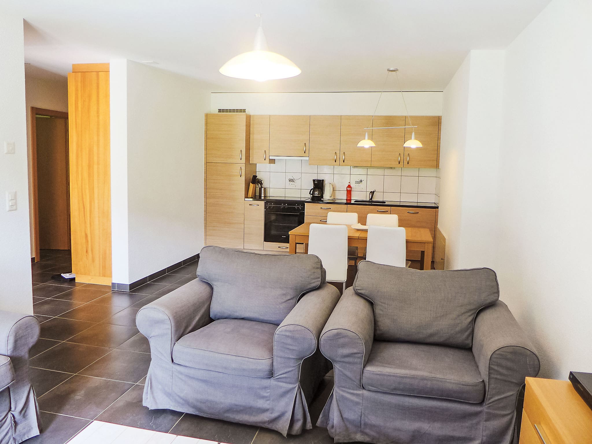 Situated within the comfortable Andromède residence, this thoughtfully appointed 2-room apartment spans 50-63 square meters across one level. The open-plan living and dining area features a double sofa bed and modern entertainment systems, while the separate double bedroom opens directly onto a private patio where you can savor morning coffee while taking in the spectacular mountain vistas. The open kitchen comes fully equipped with modern appliances including an oven, dishwasher, ceramic hob, microwave, and electric coffee machine, plus a traditional fondue set for authentic Swiss dining experiences. The bathroom features a relaxing bathtub, perfect for unwinding after days on the mountain.
