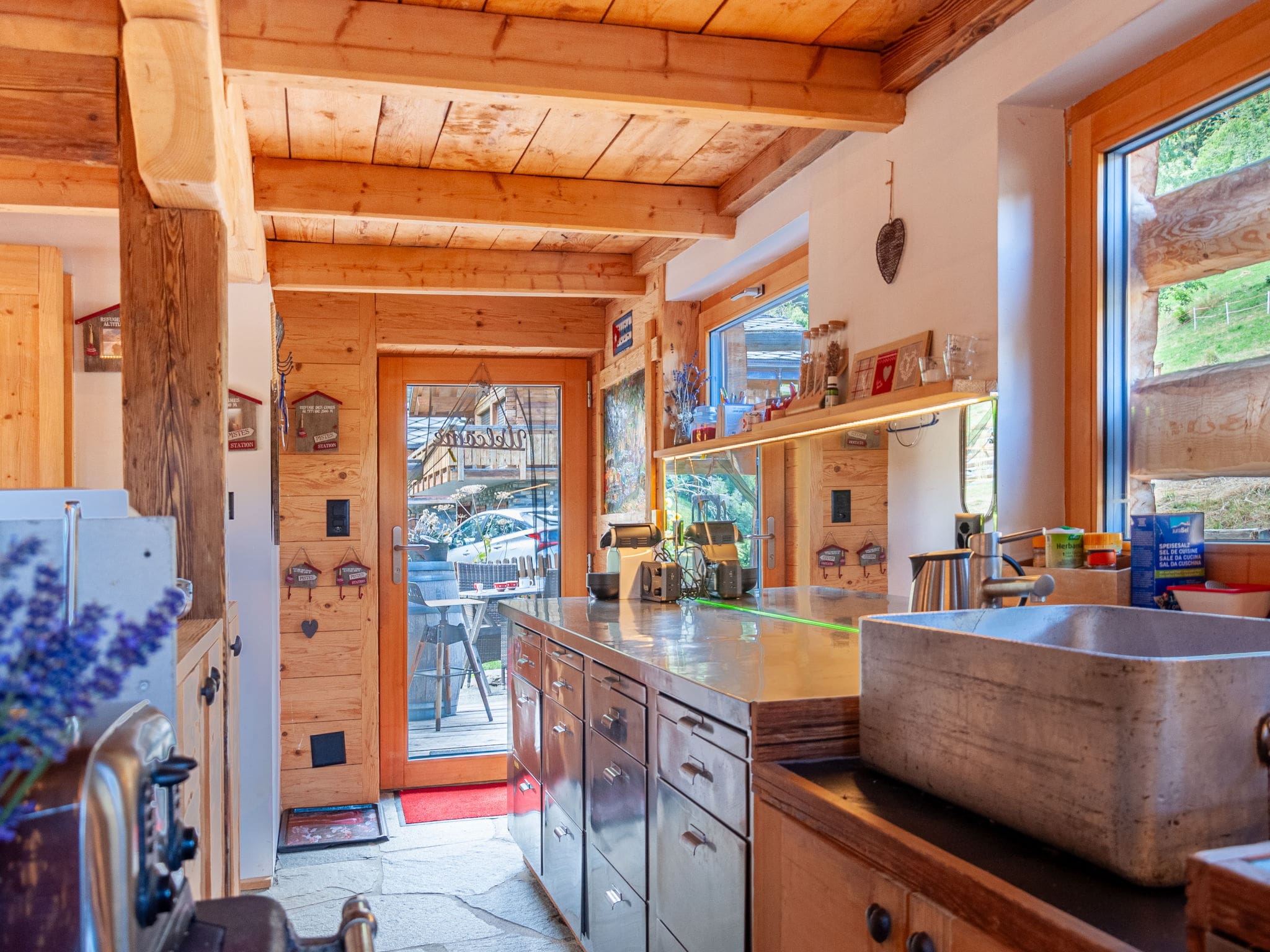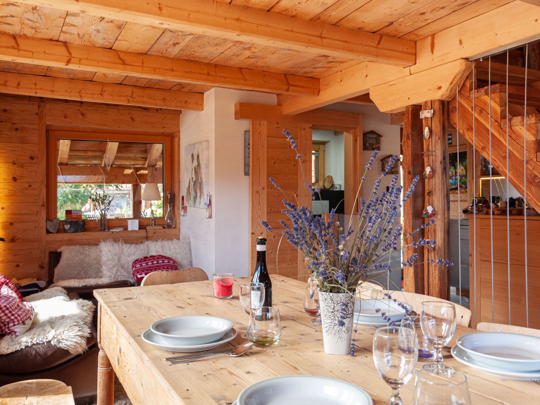 The 70-square-metre chalet showcases romantic wooden furnishings throughout its thoughtfully designed interior spaces. The heart of the home features an inviting living and dining area anchored by a traditional Scandinavian wood stove, perfect for cozy evenings after days exploring the mountains. The open-plan kitchen comes fully equipped with modern appliances including an induction hob, oven, dishwasher, and Nespresso coffee machine, plus a fondue set for authentic Swiss dining experiences.