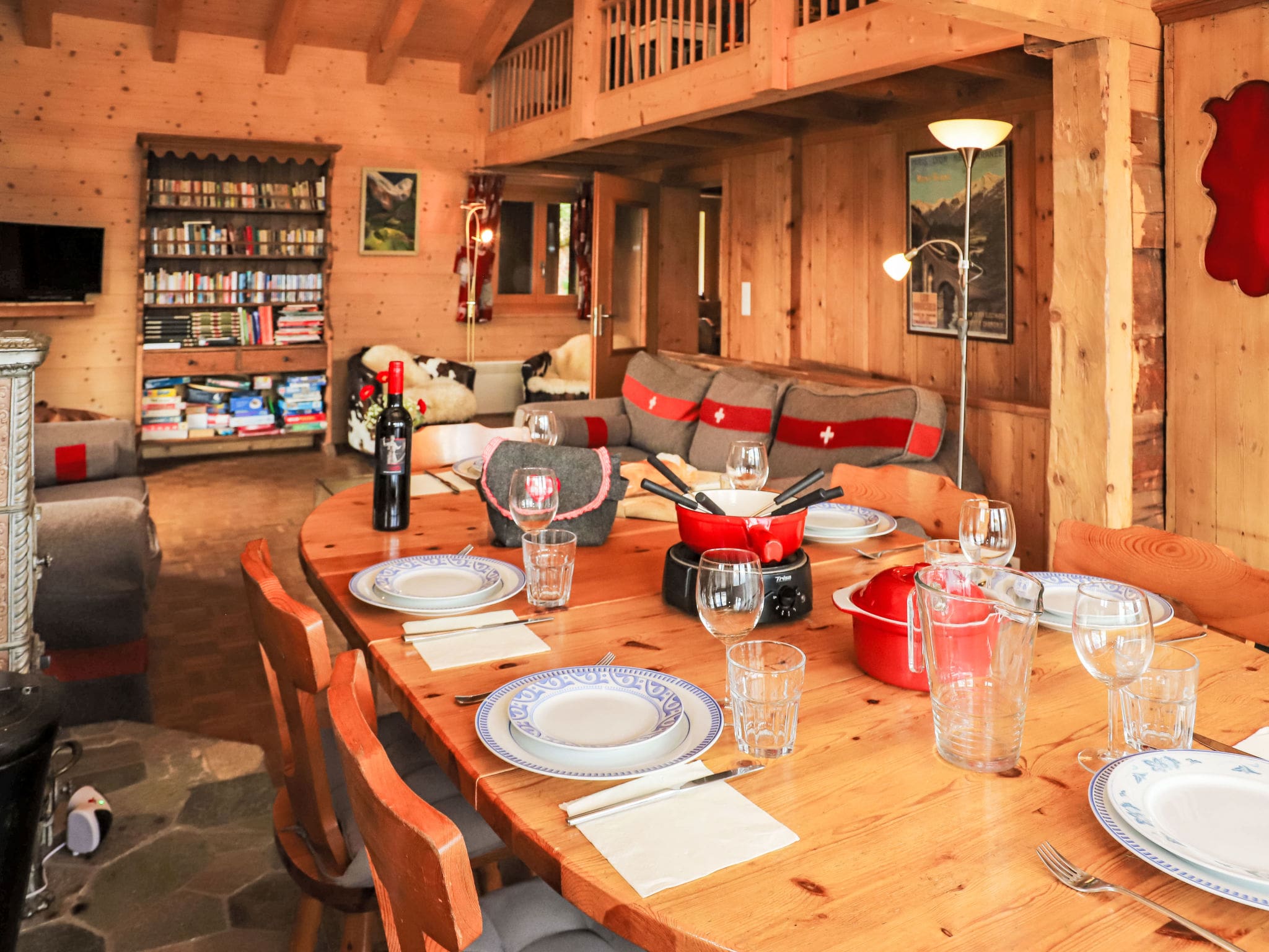 The fully equipped open kitchen includes everything needed for self-catering, from a dishwasher and microwave to speciality Swiss equipment including a raclette grill and fondue set. Three comfortable bedrooms accommodate up to six guests, with a twin room featuring an en-suite shower on the main level, and two additional bedrooms on the lower ground floor sharing a well-appointed bathroom with bathtub and double basin.