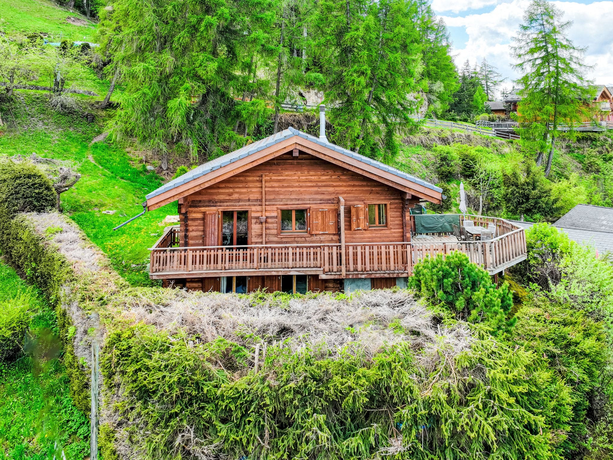 The elevated position ensures uninterrupted panoramic views of the surrounding peaks and valley floor, creating a constantly changing backdrop of natural beauty. Private parking for two vehicles sits just 30 metres from the property, with a charming stepped path leading to the chalet entrance.
